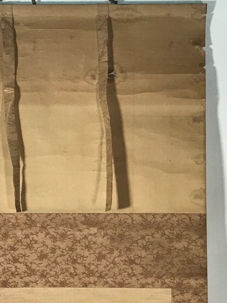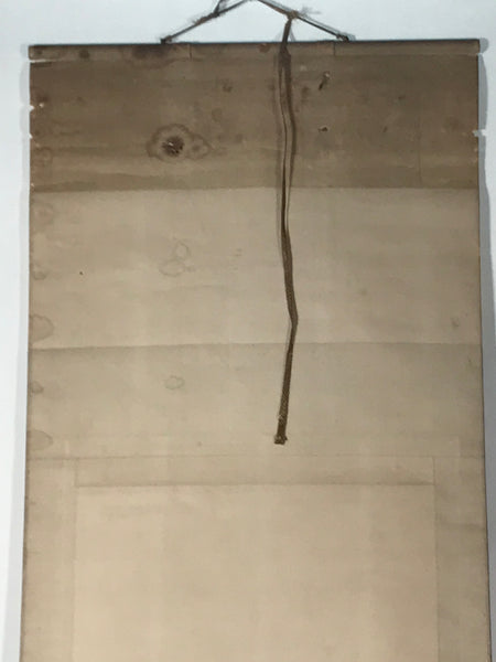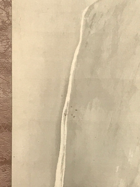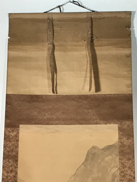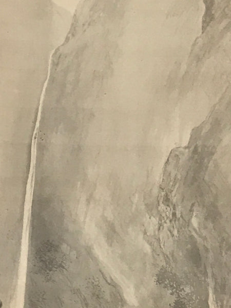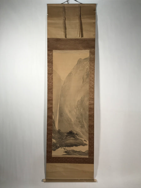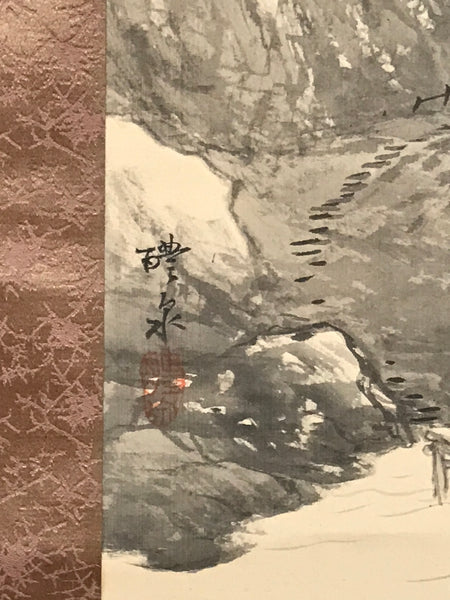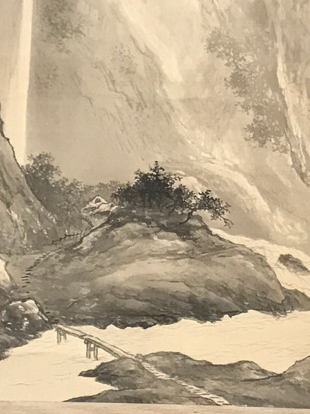 This vintage Japanese hanging scroll (kakejiku or makimono) features a landscape scenery with high mountains, a thin waterfall, and a river and a bridge at the bottom of the composition. This type of kakejiku is called sansui, literally mountains and water. It is painted with black ink. This piece is signed with a name and a red seal.