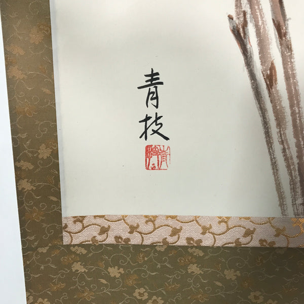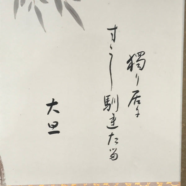 This vintage Japanese hanging scroll (kakejiku or makimono) features a sacred bamboo, called Nanten in Japanese, bearing red fruits and calligraphy of a short poem. It is signed with a name and a red seal.