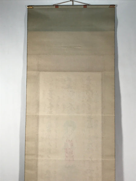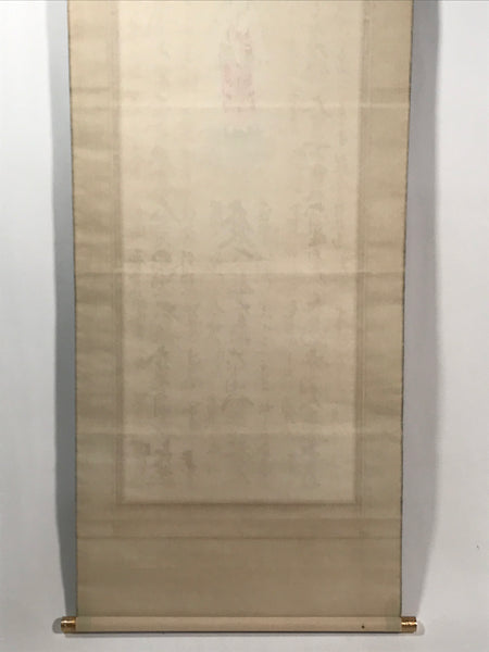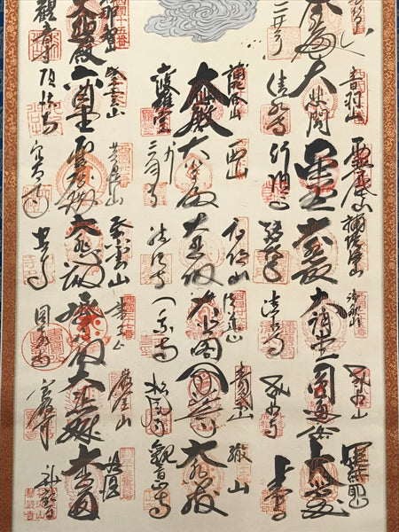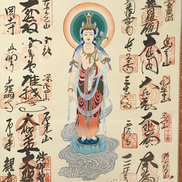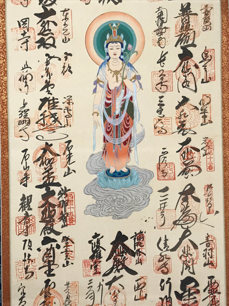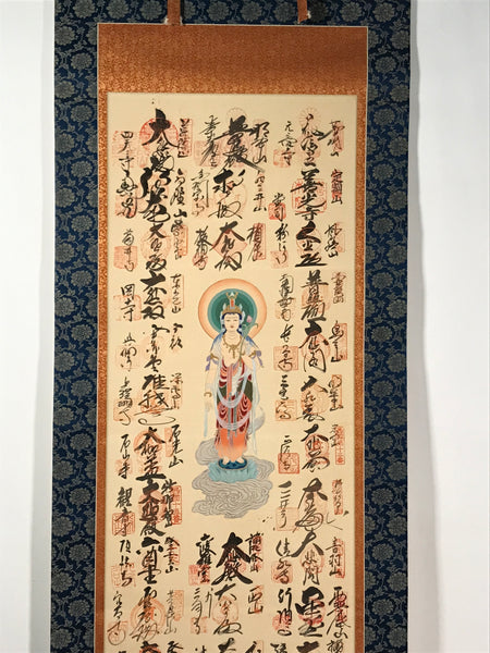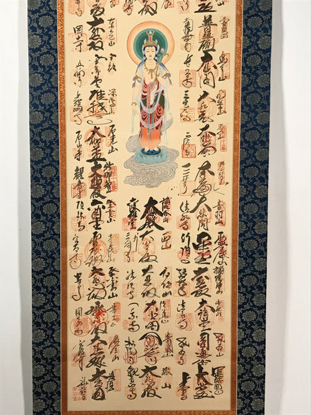 This vintage Japanese hanging scroll (kakejiku or makimono) features an image of the Buddhist deity Kannon. All around that central image, there are 33 names and goshuin red stamps of sacred places. The base of this scroll features a beautiful blue floral pattern.