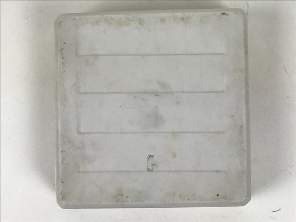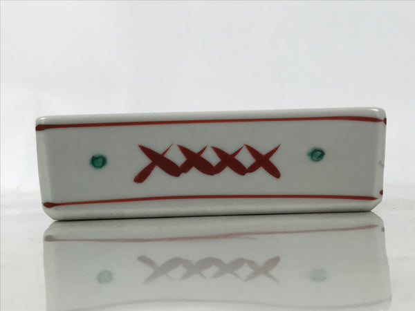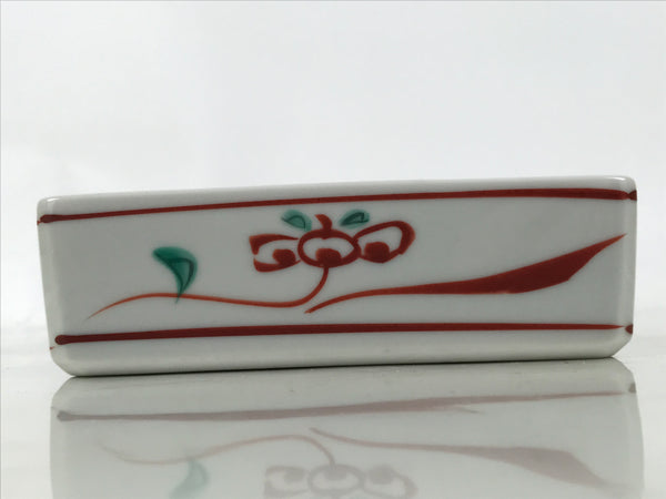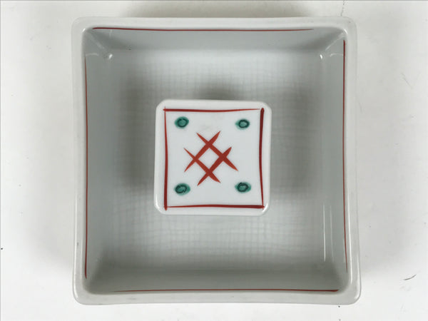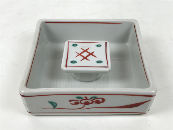 This is a vintage Japanese Tachikichi porcelain ashtray (haizara). It is mostly white with red and green lines and floral designs, and is a square shape. There is a raised square piece at the center.