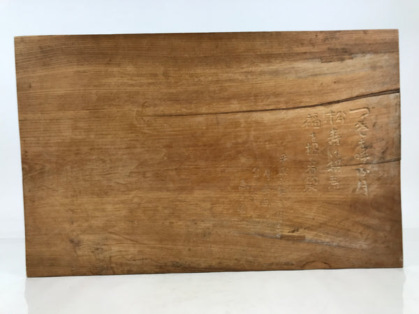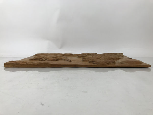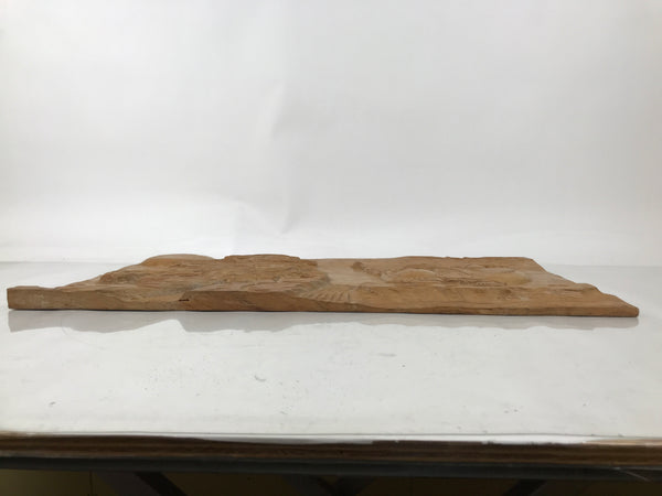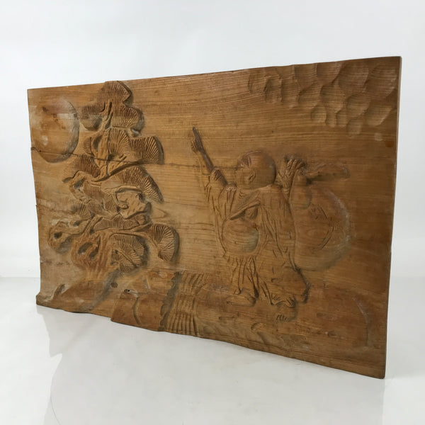 This is a large vintage Japanese hand-carved wooden board art depicting one of the Seven Lucky Gods, Hotei. Hotei is often associated with good fortune, popularity, and is considered a guardian of children. His prominent features include a bald head and a round, often exposed, belly. He carries a large branch with a sack and a hyotan gourd bottle attached to it. This piece also has a large pine tree and a rising sun.