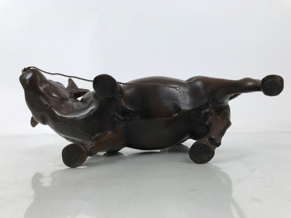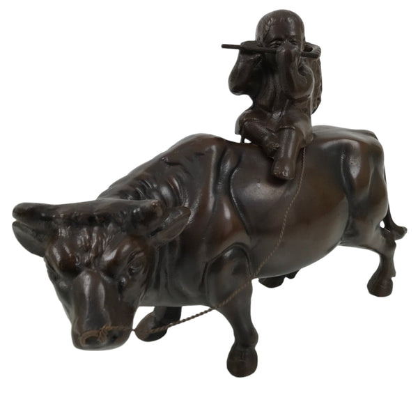 This is a vintage Japanese bronze statue that depicts a cow with a boy on its back. This motif is from the Jugyuzu Zen teaching known as Kigyukika, which is the sixth step of the ten steps to get enlightenment. This metal statue is brown. The boy is set on the cow with two pins, and a string connects the cow and the boy.