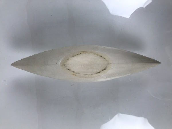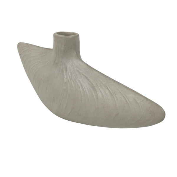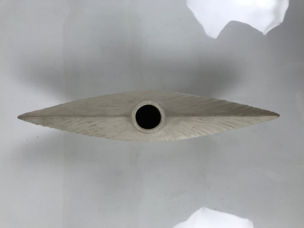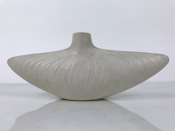 This is a vintage Japanese ceramic flower vase, or kabin. This unique vase is off-white and shaped like a flat boat. Textured lines spread from the small opening at the top. It can be used for all types of flower arrangements both ikebana and casual and also as a statement piece to decorate your entrance.