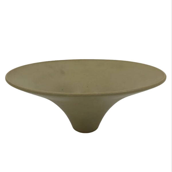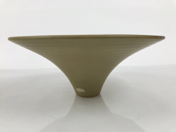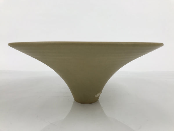 This is a vintage ceramic Japanese flower vase, or suiban. This piece is large and a round bowl shape that tapers into a pedestal-style foot. It is glazed a matte, sandy-textured beige.