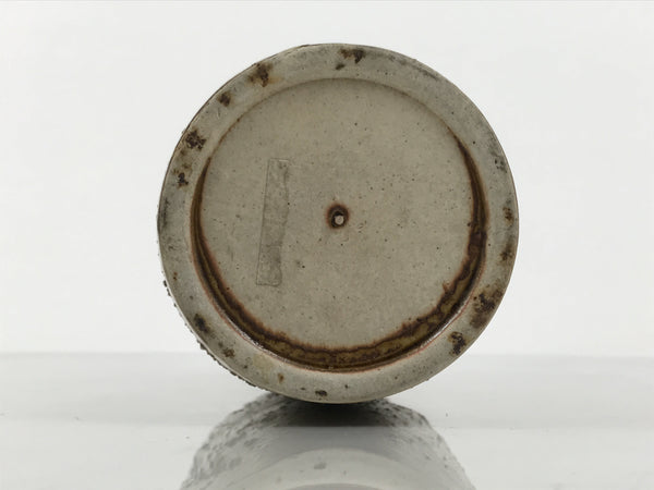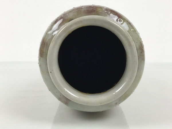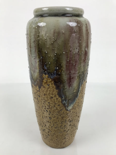 This is a vintage Japanese porcelain flower vase, or kabin. This vase is brown and greenish-gray, with a tapered cylindrical shape. It features a speckled texture and a natural glaze from the firing process. It can be used for all types of flower arrangements, both ikebana and casual, and also as a statement piece.