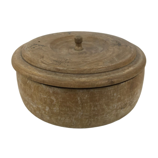 This is a Japanese vintage lidded snack bowl, or kashiki. This brown bowl is handcrafted from a piece of solid wood and retains the natural look without any sort of lacquer or paint. There are some black markings on the lid, perhaps drawings, but they've worn off and are indiscernible.