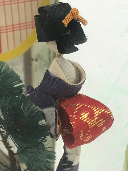 Japanese Geisha Figurine Vtg Purple Kimono Birds Glass Case Display ST17
