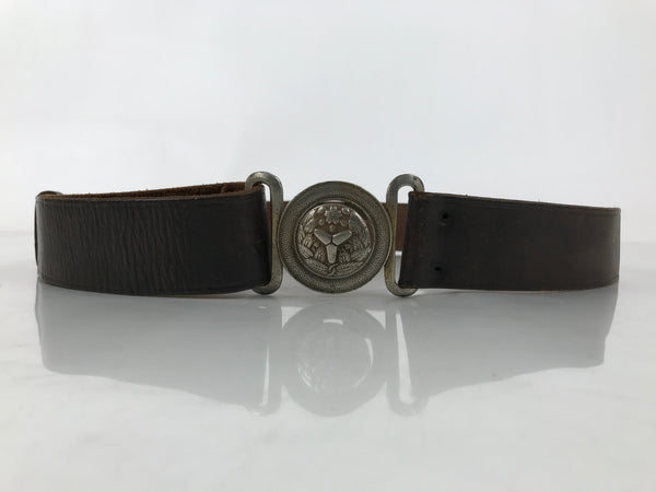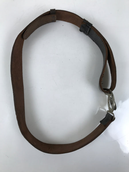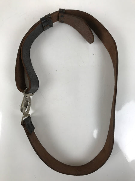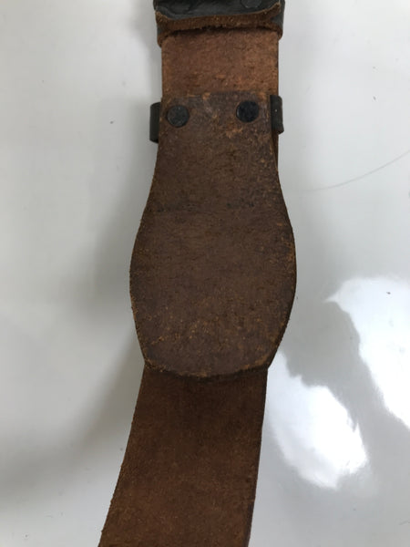 This is a vintage Japanese fireman's dress uniform leather belt. It is made of sturdy brown leather and fastened together with a silver metal locking clasp. The clasp is round and fits through a cross-shaped hole that holds the belt together by tension. The clasp has a round image of the old National Fire Department insignia along with leaves and a cherry blossom.