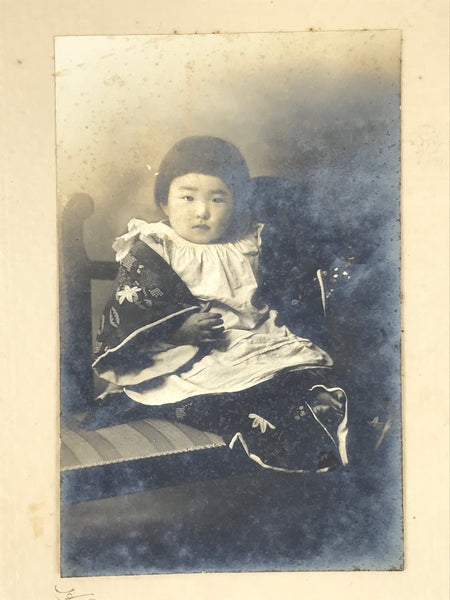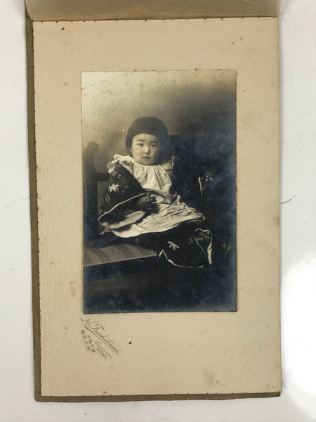 This is an antique Taisho Era baby/toddler portrait photograph in black and white. It is of a young girl sitting on a bench dressed in a simple white child's pinafore dress with a silk haori jacket. It comes adhered to a paper folding cover.