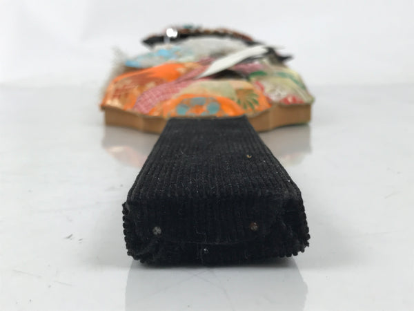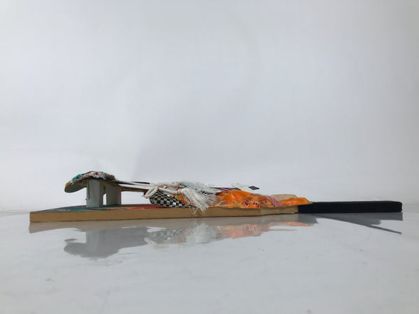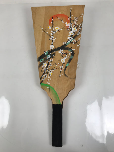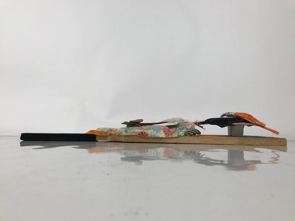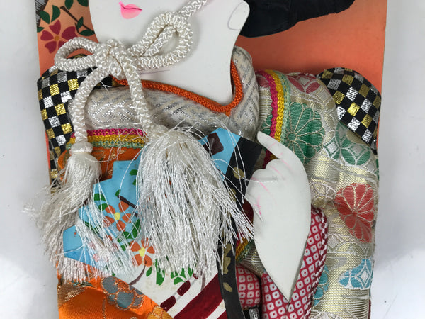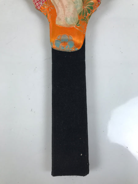 This Japanese vintage wooden paddle is decorated with a three-dimensional fabric art (Oshie-Hagoita) of a woman or geisha in a kimono, also called hagoita. It shows a Japanese woman (geisha) dressed in a gorgeous orange, silver, red, and gold kimono with floral and geometrical patterns. The woman holds a fan and wears a traditional hairdo with a magnificent orange and gold headpiece. The cloth part of the kimono is made of silk and other fabrics. The back of the paddle is painted with plum blossoms. The handle is covered with a black velvet fabric. **Shuttlecocks are not included.