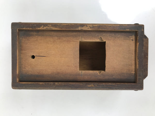 This is an antique Japanese wooden box for a shaver or plane used to shave dried bonito and make bonito flakes, though it doesn't include a blade. It is a box with a drawer and has a square hole on the top. After setting a plane on the square hole and shaving dried bonito, the shavings are placed in the drawer. Many Japanese dishes use bonito flakes, such as making soup or Dashi, or as seasonings or spices.