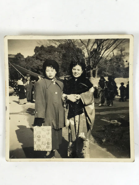 This is a Japanese vintage black and white portrait photograph of two women, one in a fashionable coat and dress, and the other in a beautiful kimono and shawl. They appear to be at some kind of festival at a public park.