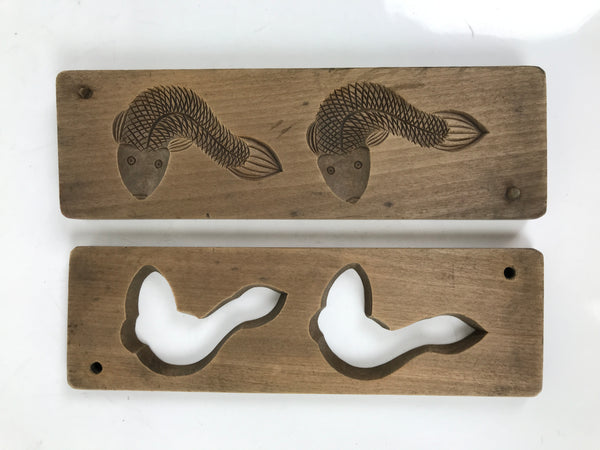 This two-panel kashigata mold is carved with the design of two gobies (haze), a common river fish in Japan. This mold can be used to make sweets or as an eye-catching decorative item.