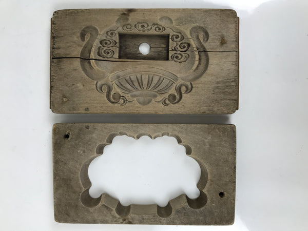 This two-panel kashigata mold is carved with the design of a frame in the shape of an incense pot (koro)with small clouds. There is an empty spot at the center to place a smaller text kashigata piece (not included). This mold can be used to make sweets or as an eye-catching decorative item.