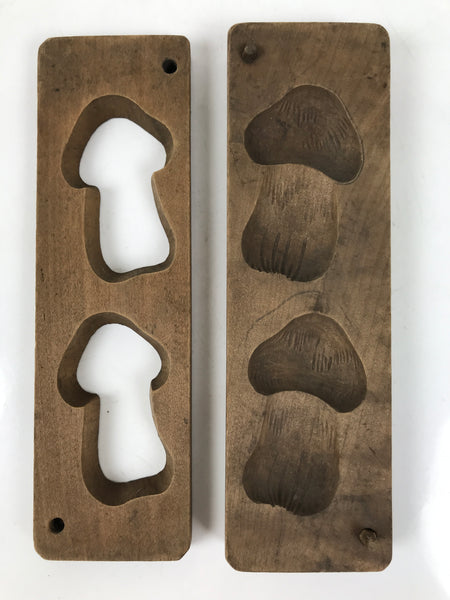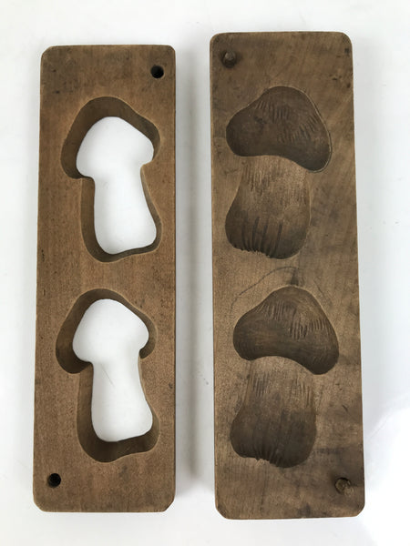 This two-panel kashigata mold is carved with the design of two mushrooms (kinoko). This particular type of mushroom is matsutake, prized for its rarity. This mold can be used to make sweets or as an eye-catching decorative item.