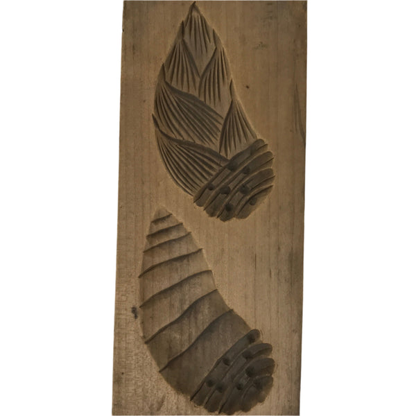 This two-panel kashigata mold is carved with the design of two bamboo shoots (takenoko). One is with the outer casings, the other is a vertical cross-section. This mold can be used to make sweets or as an eye-catching decorative item.