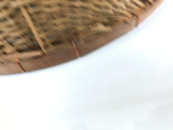 This is a vintage traditional natural bamboo woven basket used for drying or draining water from various items such as tea leaves, small vegetables like edamame pods, etc. This particular type of handwoven zaru is completely round with no open sides, and is bound together by copper metal wire.