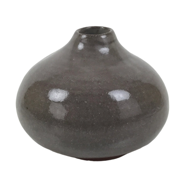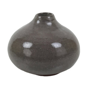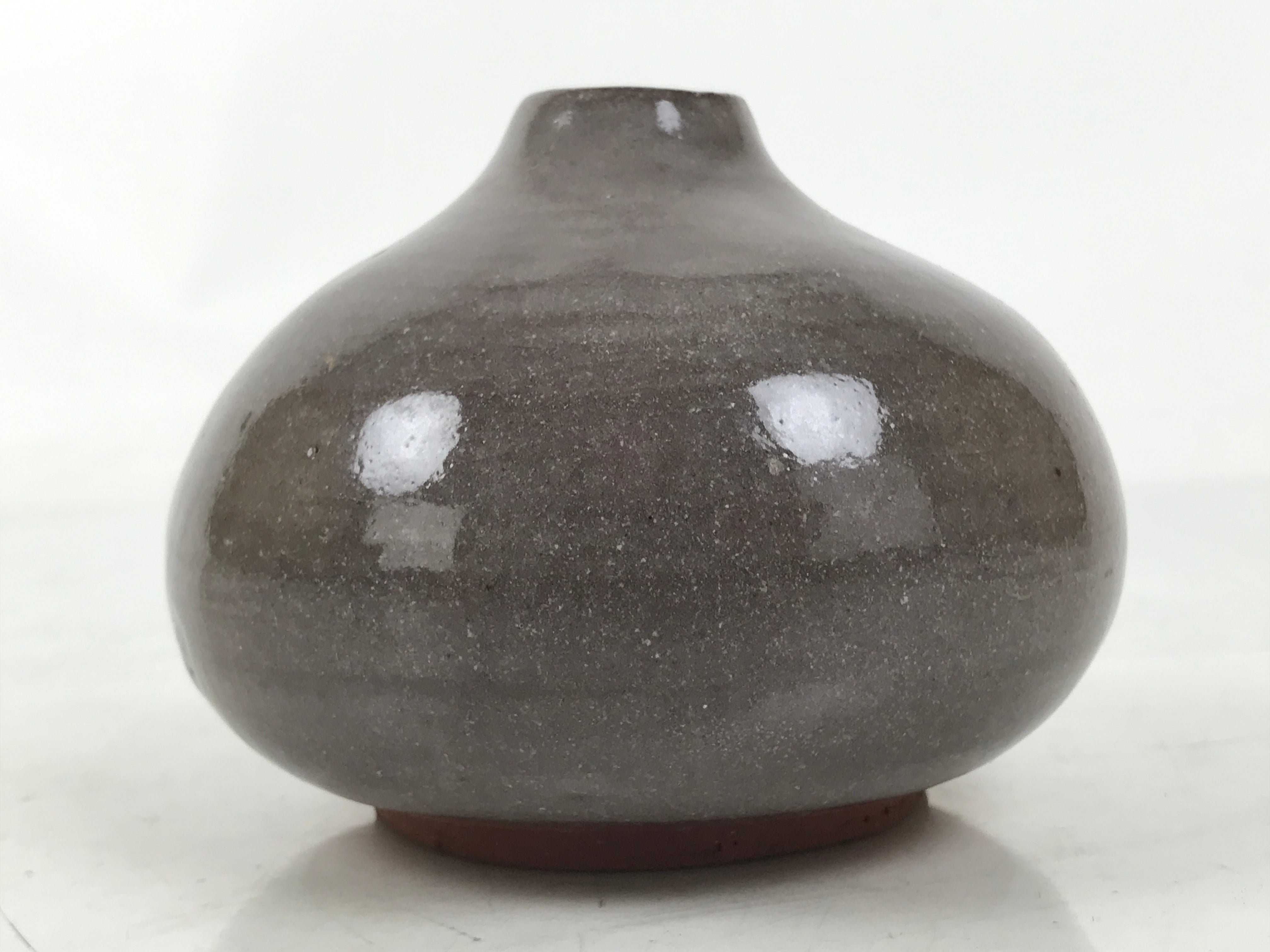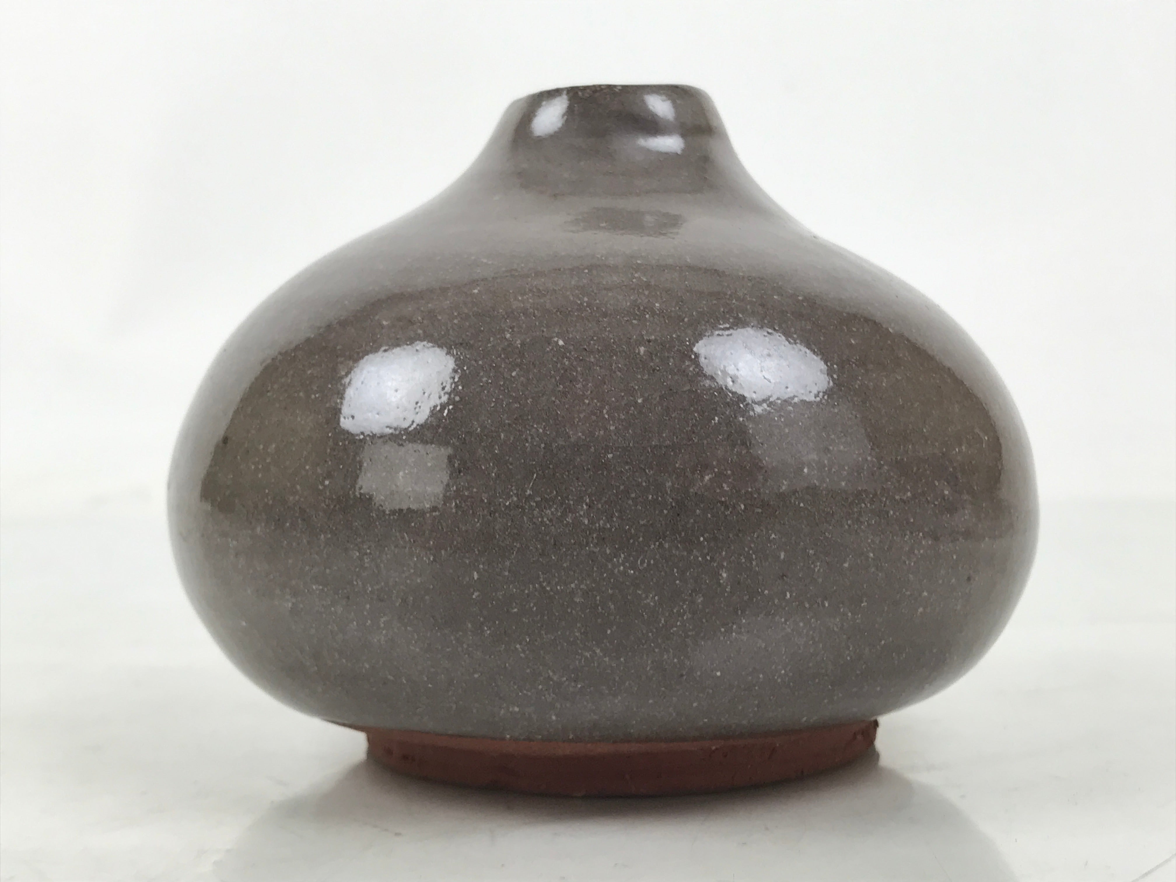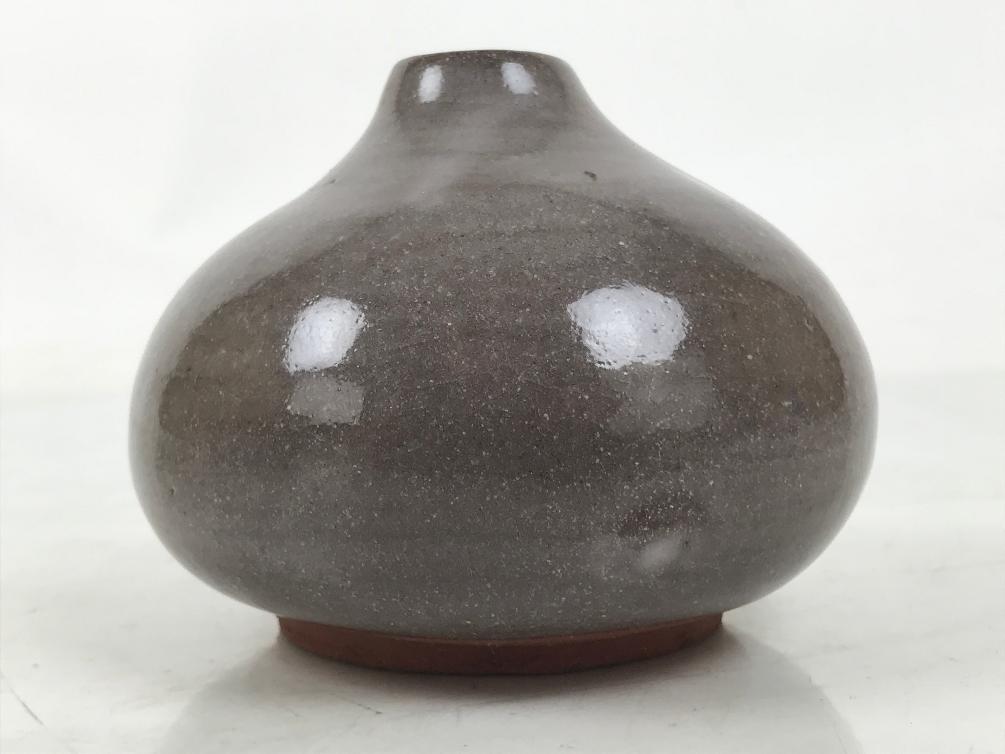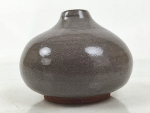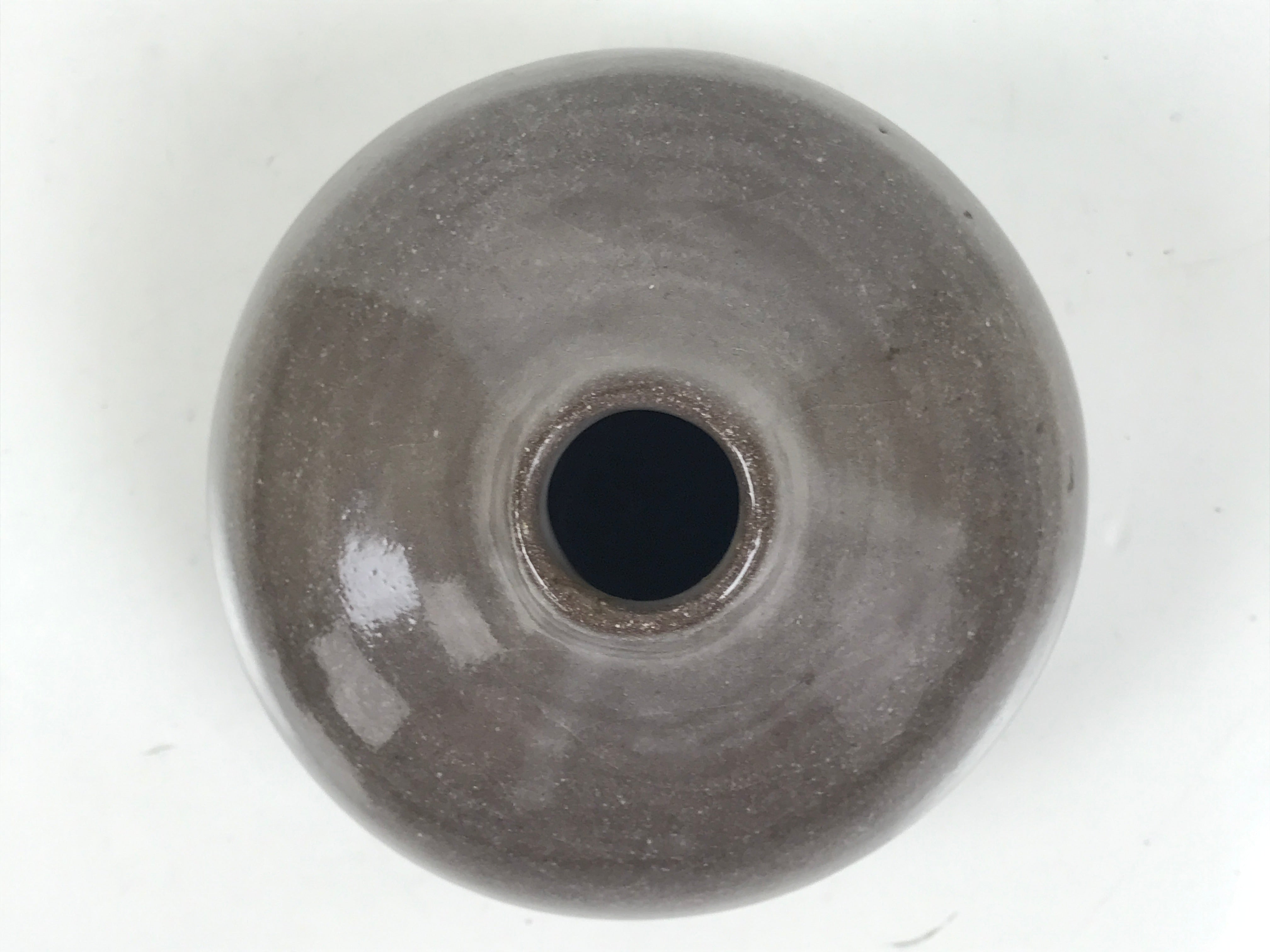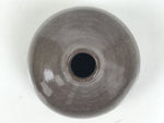 This is a vintage Japanese ceramic flower vase, or kabin. It has a round body and a short neck. Gray crackle glaze covers a rough-textured base. On the bottom, there is a date of May 10th, 1998. This vase is small enough for a single flower (ichirin zashi).