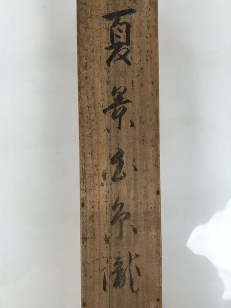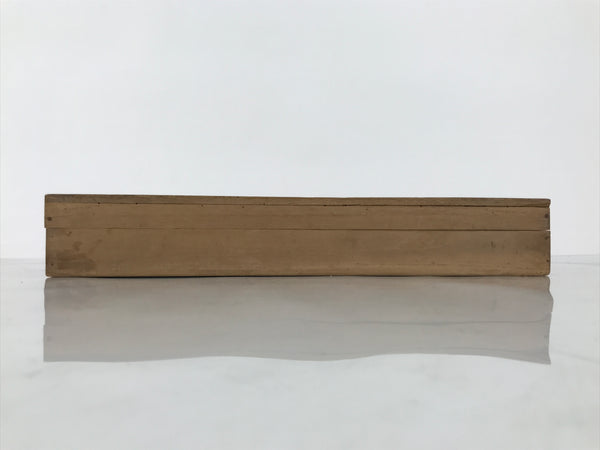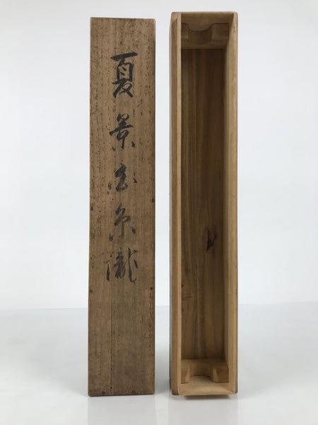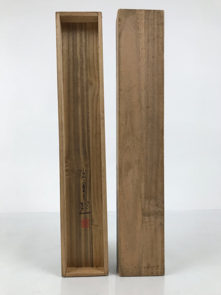 Hand-crafted and in a light brown wood color, this sturdy, slender box is made to store a hanging scroll, or kakejiku. The lid fits flush on the top. It has two wooden brackets inside the box to secure the scroll. This specific box has inscriptions on the top, and a sign and a red seal on the inside of the lid.