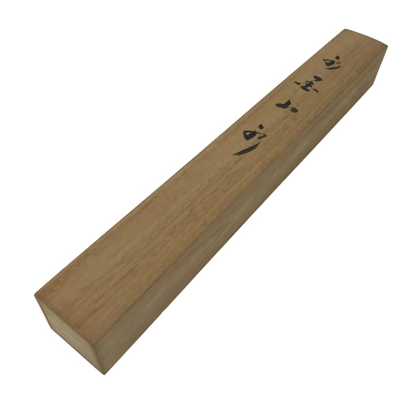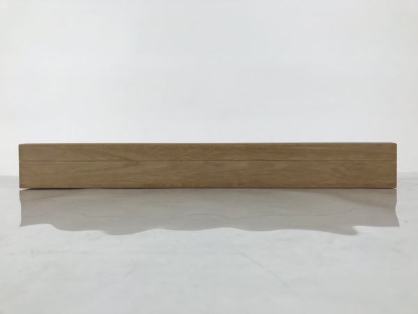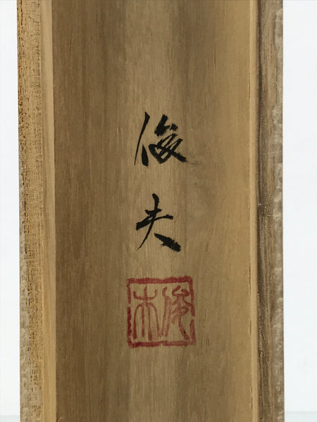 Hand-crafted and in a natural wood color, this sturdy, slender box is made to store a hanging scroll, or kakejiku. The lid fits flush on the top. It has two removable wooden brackets inside the box to secure the scroll. This specific box has inscriptions on the top, and a red seal and a sign on the inside of the lid.
