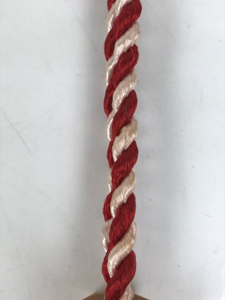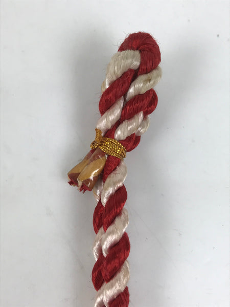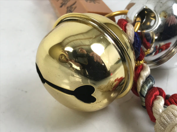 This is a vintage Japanese good fortune amulet, or omamori, from Ise Jingu. It features two functional metal bells, gold and silver, and can be hung thanks to a string. The string is white and red and goes through a resin hexagonal prism with inscriptions. The end is decorated with two tassels.