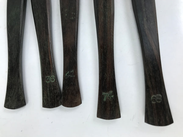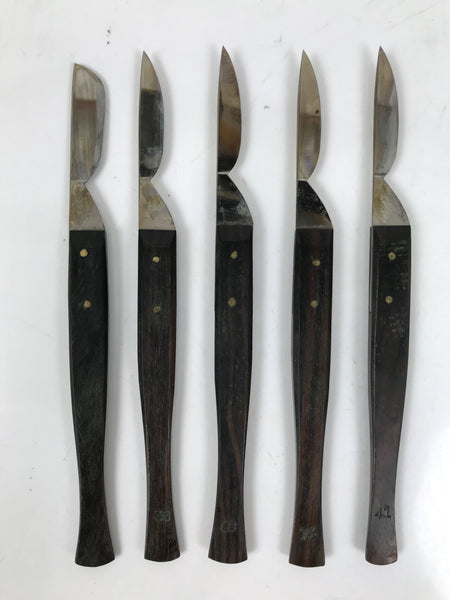 This is a five-piece set of vintage Japanese scalpels in a paper box with a wooden stand. Four have similar blades, and one has a different type of blade.  The scalpels have a stainless blade and a wooden handle, and four have a number inscription on the handle.