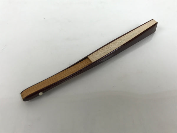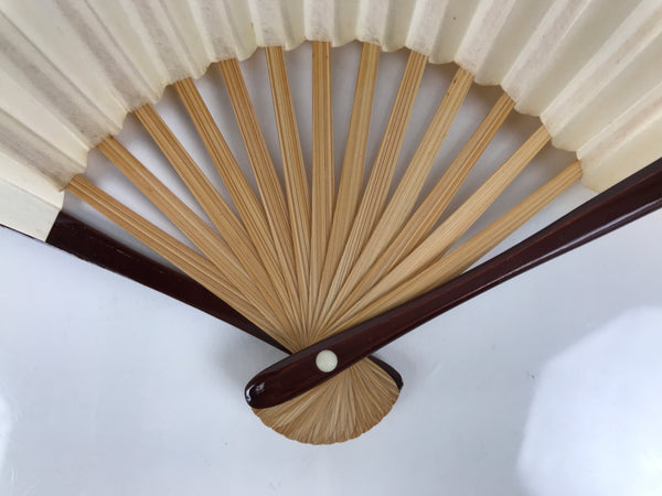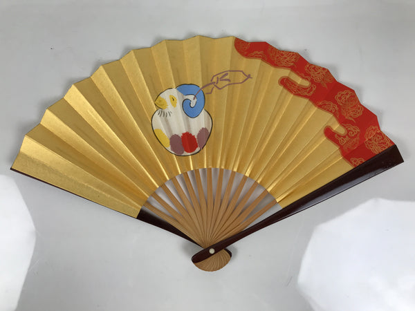 This is a miniature traditional Japanese folding fan called sensu. You can use this when it's hot or as decoration. This fan is made with a natural bamboo frame (with lacquered ends) and sturdy washi paper. It features a white and multi-color horned sheep in the shape of a clay bell (dorei) on a gold background. There is a red accent in the upper right with gold clouds. The back side is plain beige.