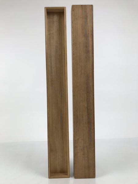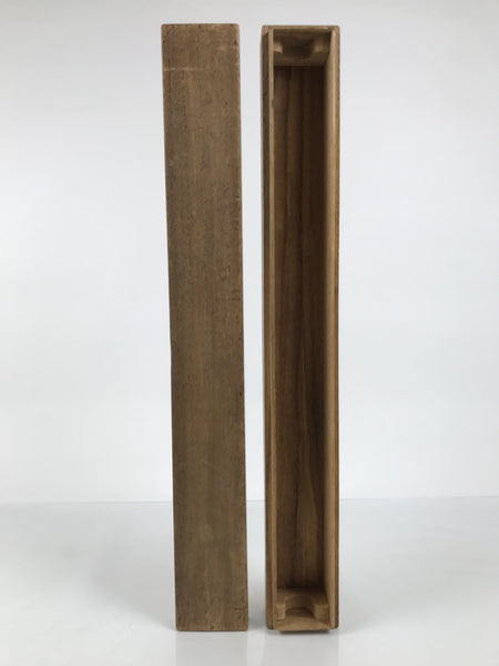 Hand-crafted and in a brown wood color, this sturdy, slender box is made to store a hanging scroll, or kakejiku. The lid fits flush on the top. It has two wooden brackets inside the box to secure the scroll. This specific box has no inscriptions.