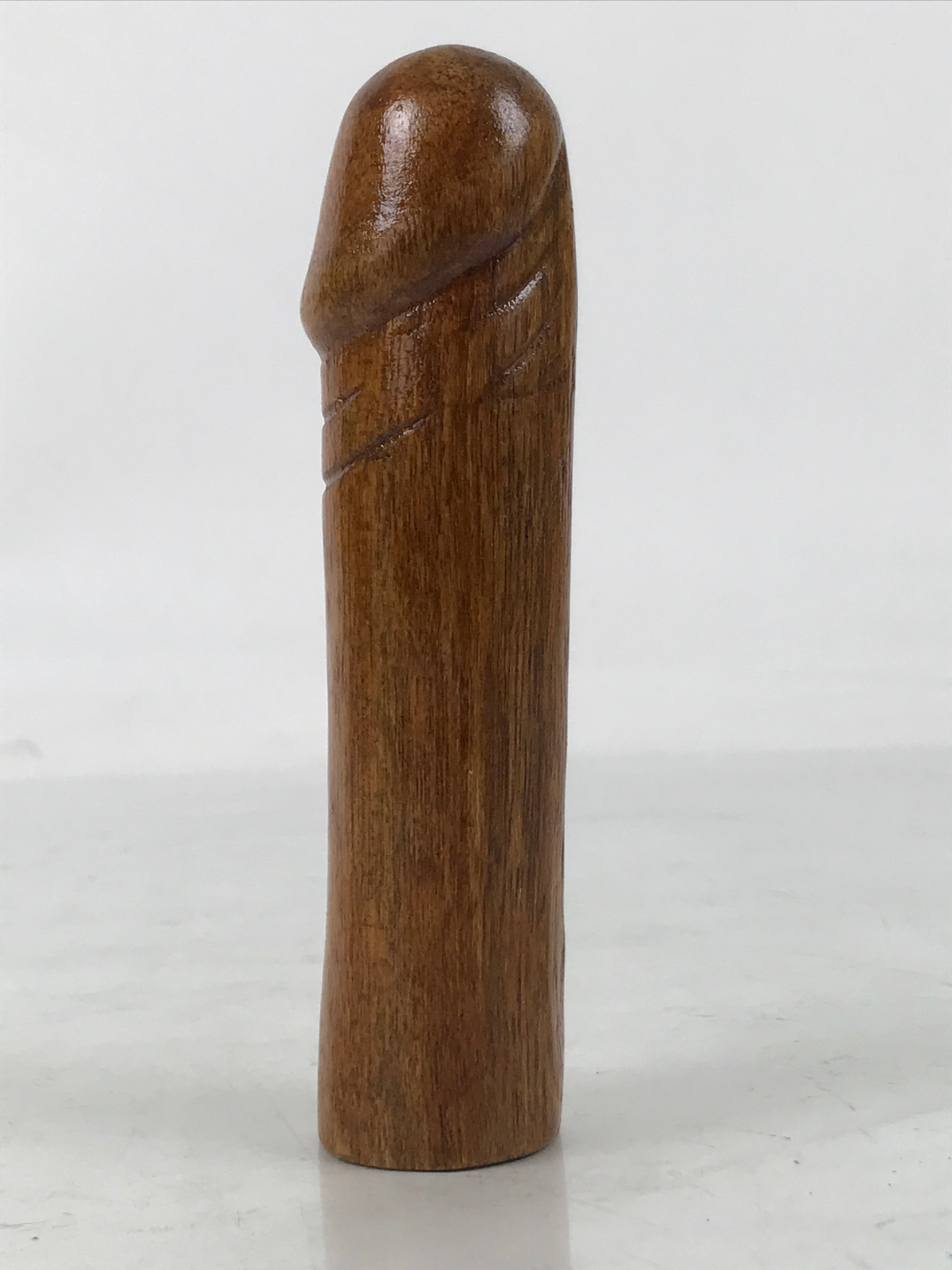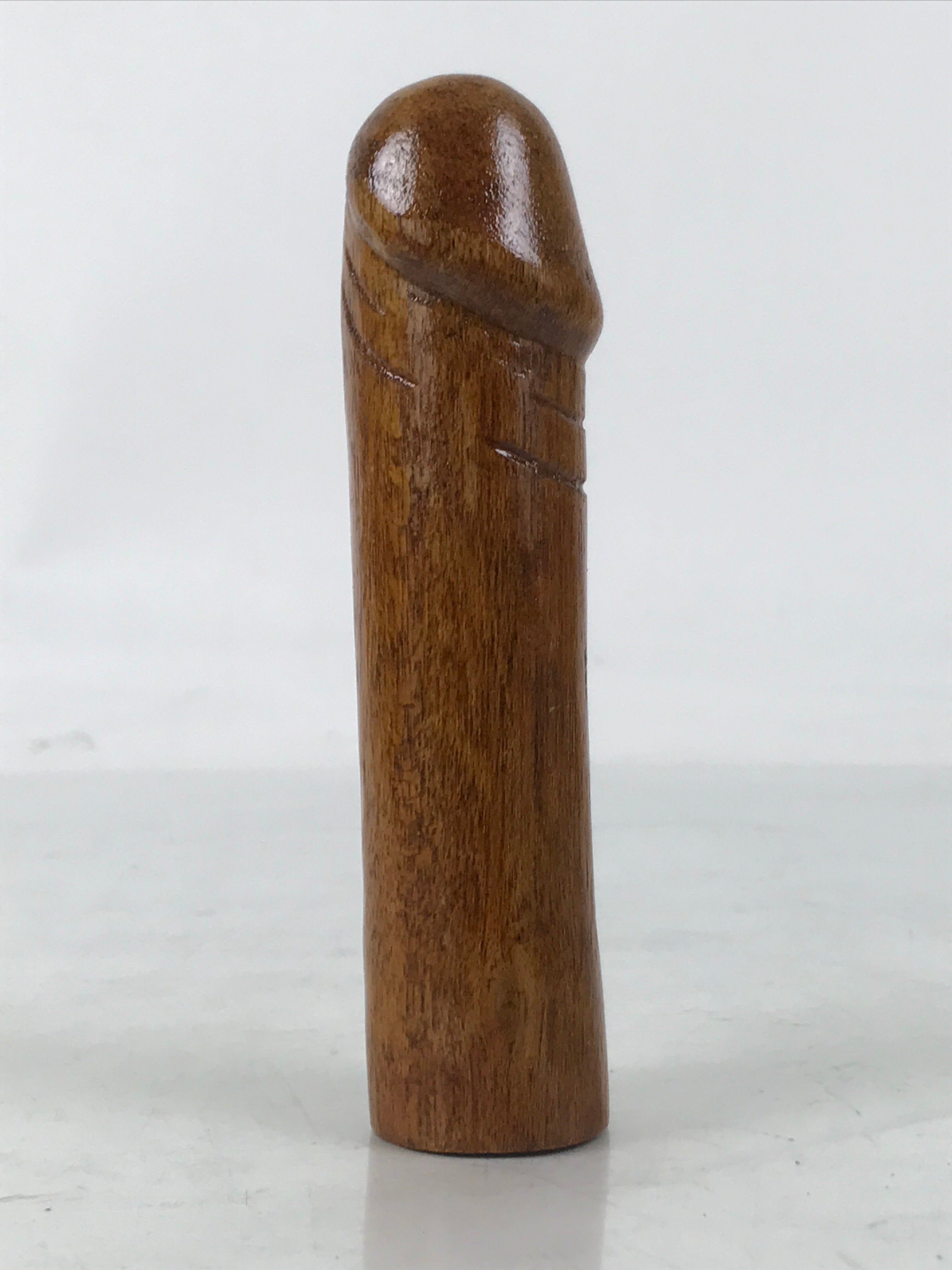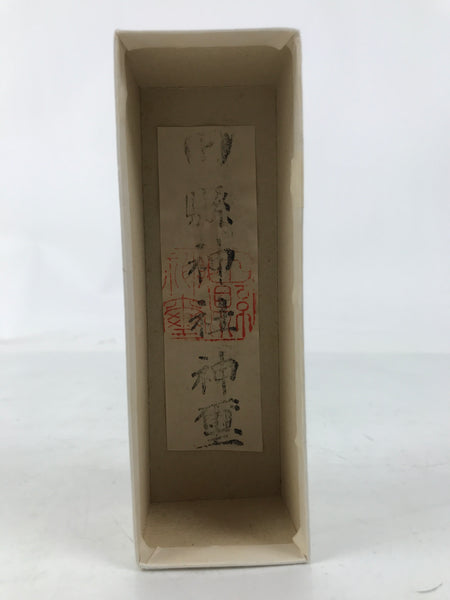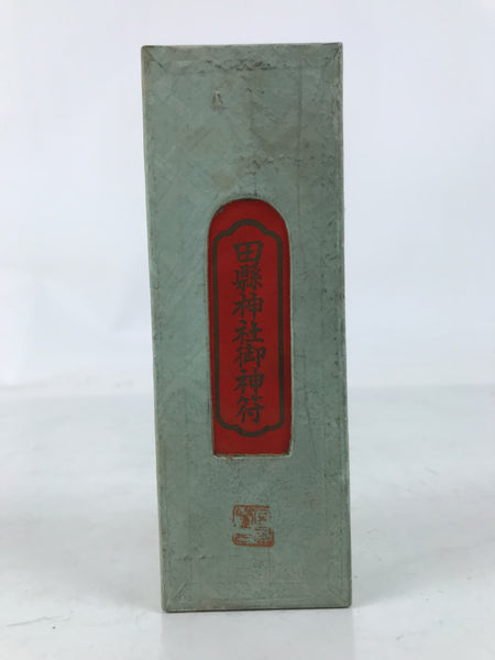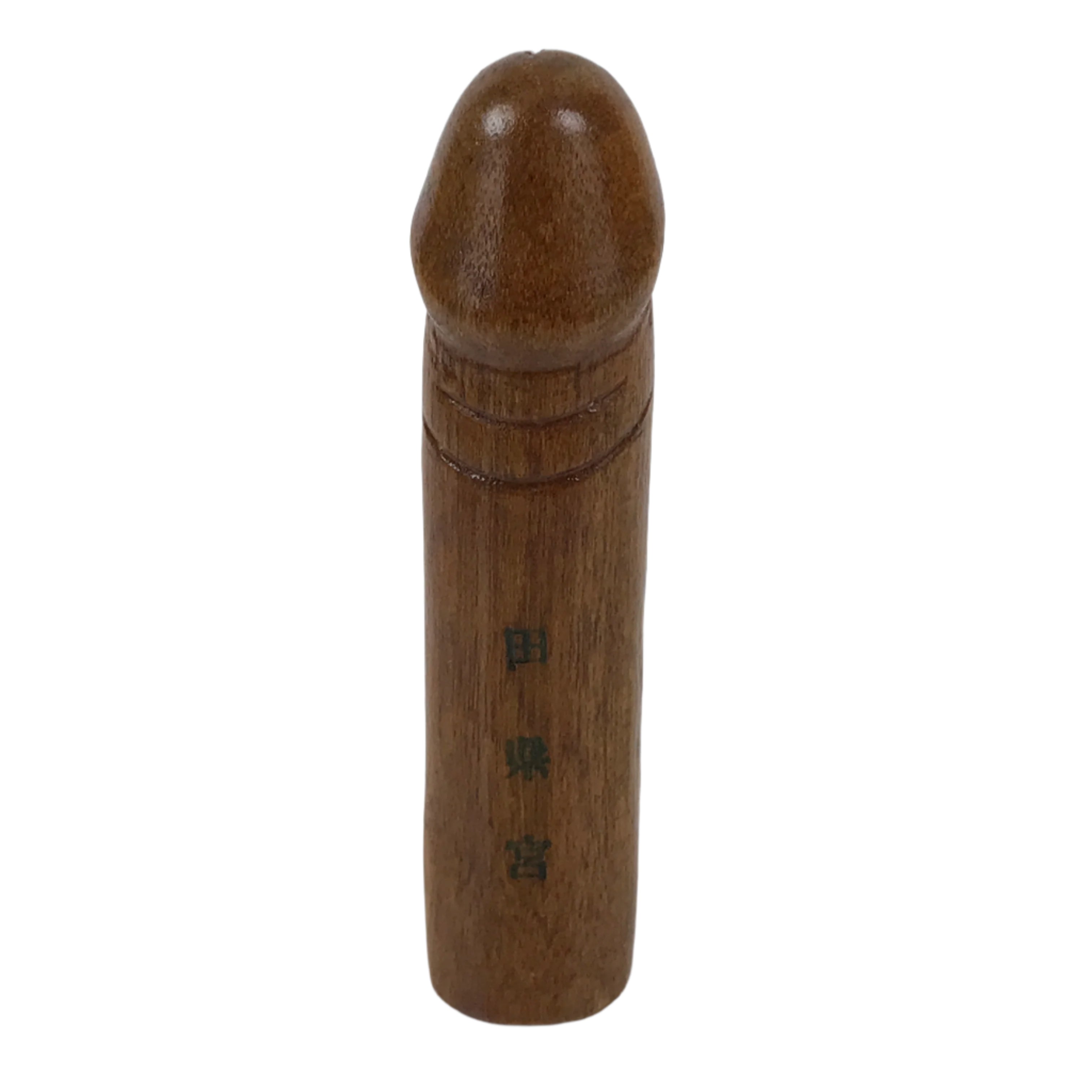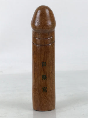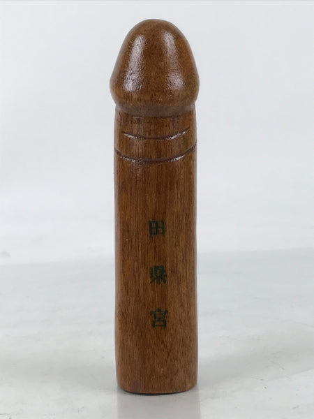 This is a vintage Japanese shrine amulet carved in a phallic shape. It is stained a medium wood brown, brushed with a clear lacquer coat, and wrapped in a white paper. This item is a talisman purchased from Tagata Shrine in Komaki, Aichi Prefecture. Every spring Tagata Shrine hosts a famous "penis" festival called Hounen Matsuri which celebrates fertility. It comes with the original paper box and a pamphlet describing the history of Tagata Shrine.