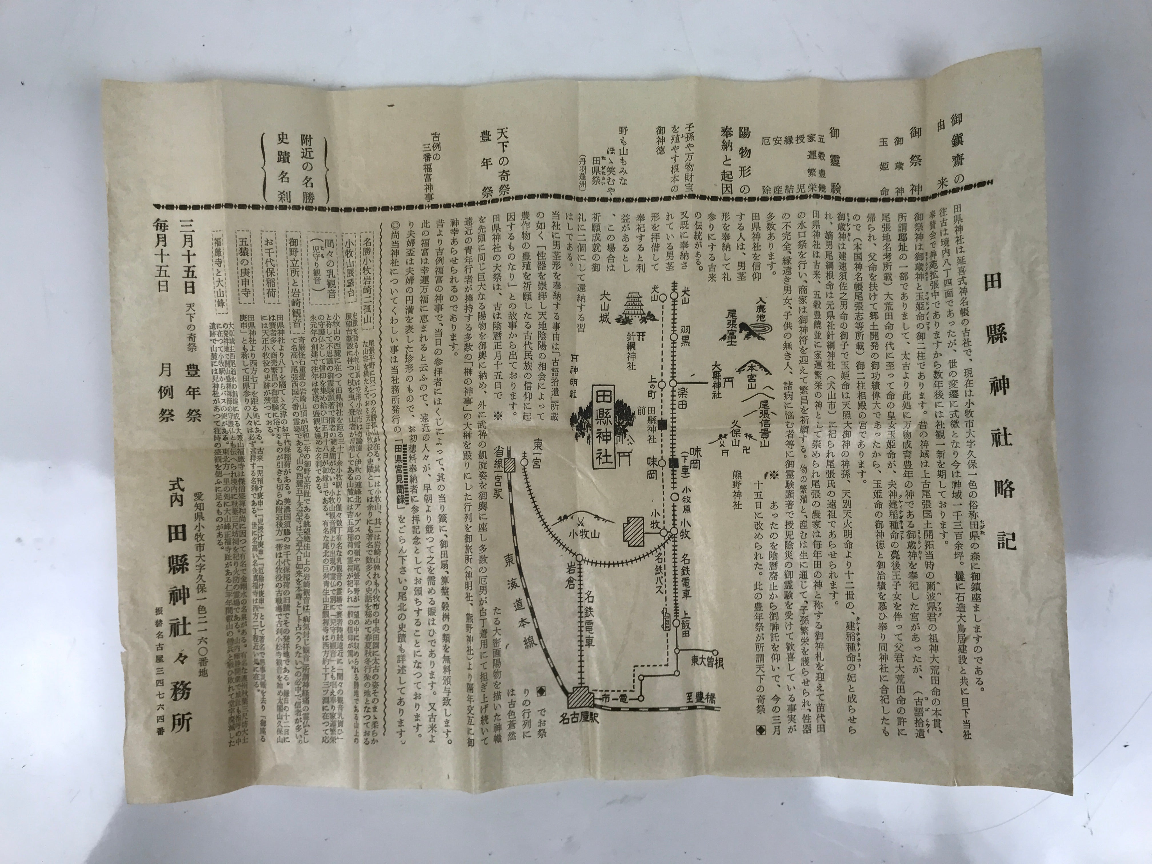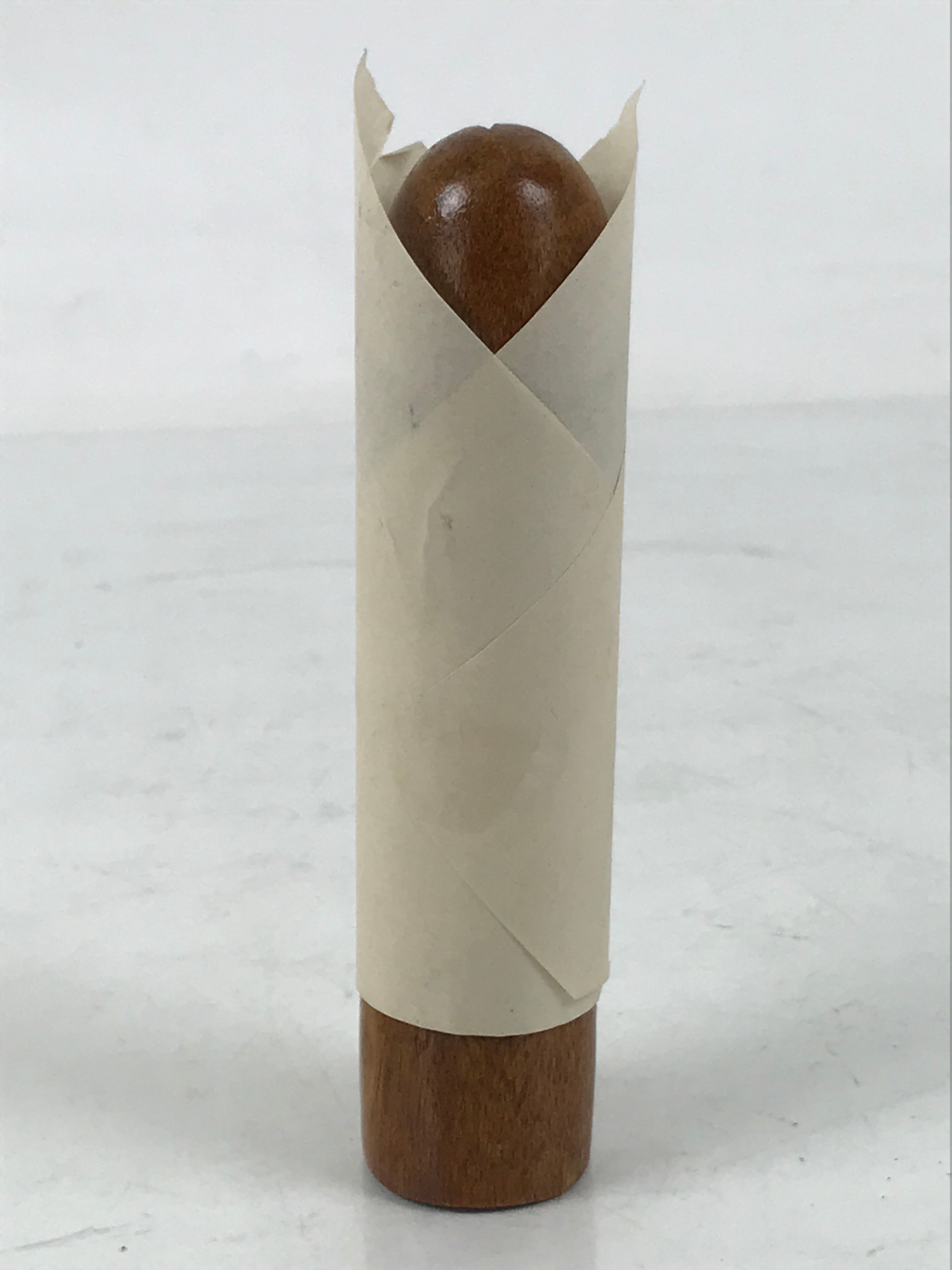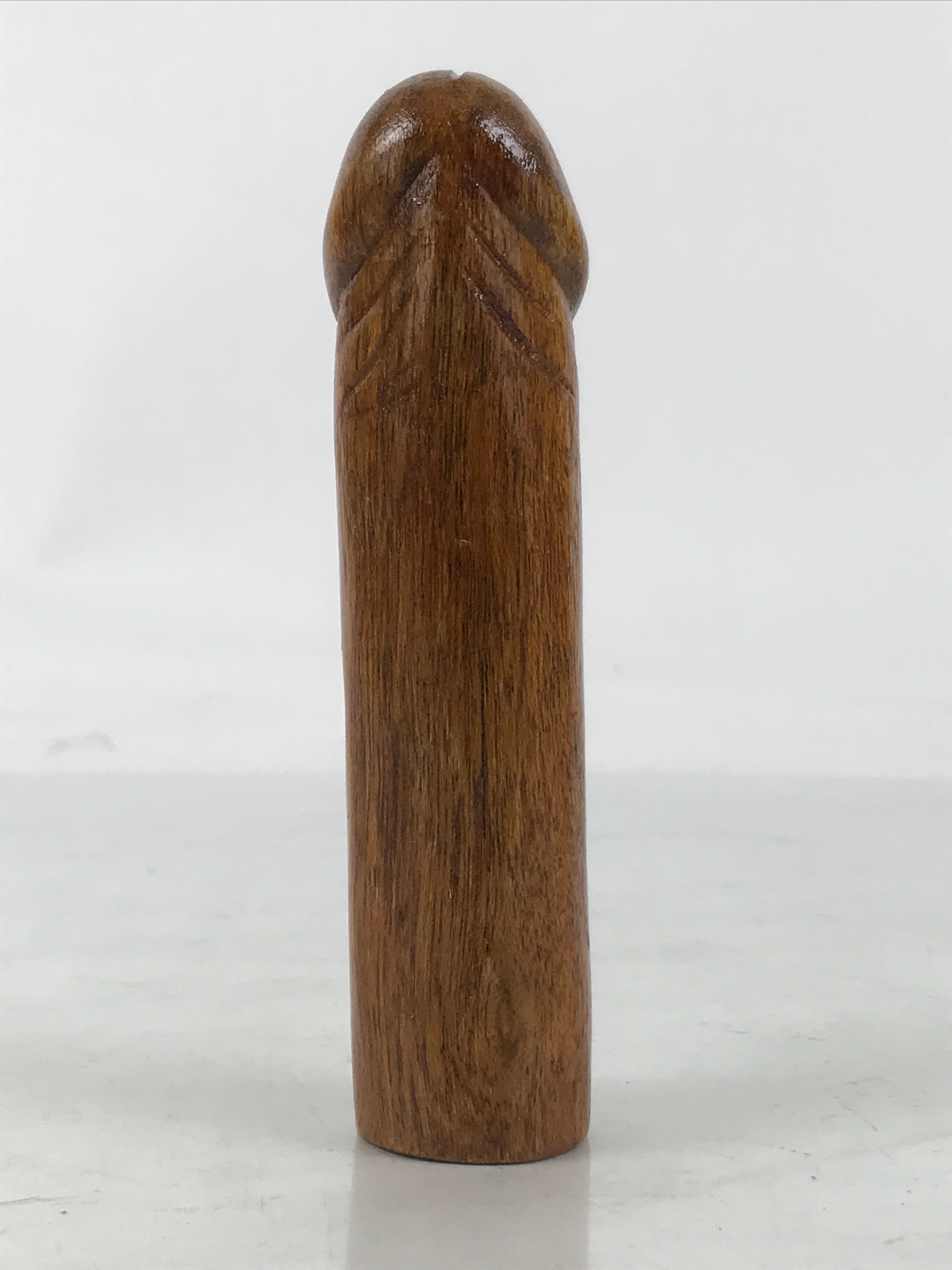 This is a vintage Japanese shrine amulet carved in a phallic shape. It is stained a medium wood brown, brushed with a clear lacquer coat, and wrapped in a white paper. This item is a talisman purchased from Tagata Shrine in Komaki, Aichi Prefecture. Every spring Tagata Shrine hosts a famous "penis" festival called Hounen Matsuri which celebrates fertility. It comes with the original paper box and a pamphlet describing the history of Tagata Shrine.