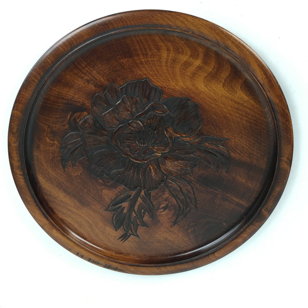 Japanese Wooden Lacquered Tray Obon Vtg Wood Carving Moutan Peony UR637