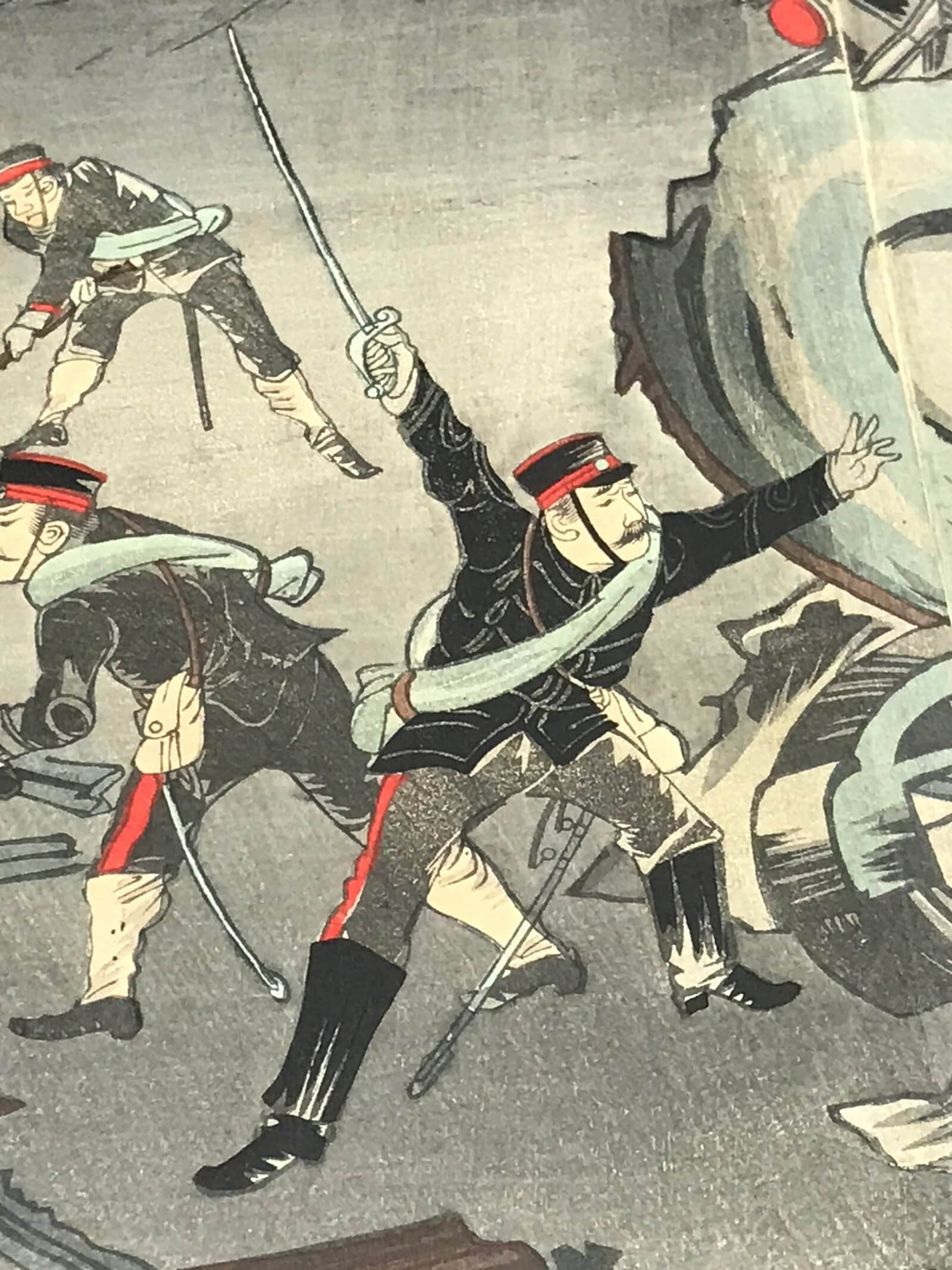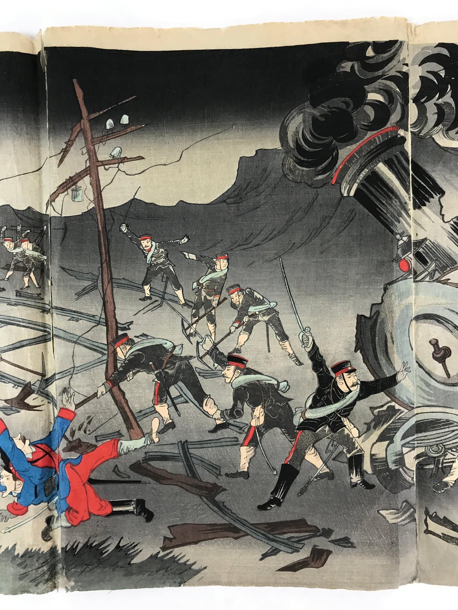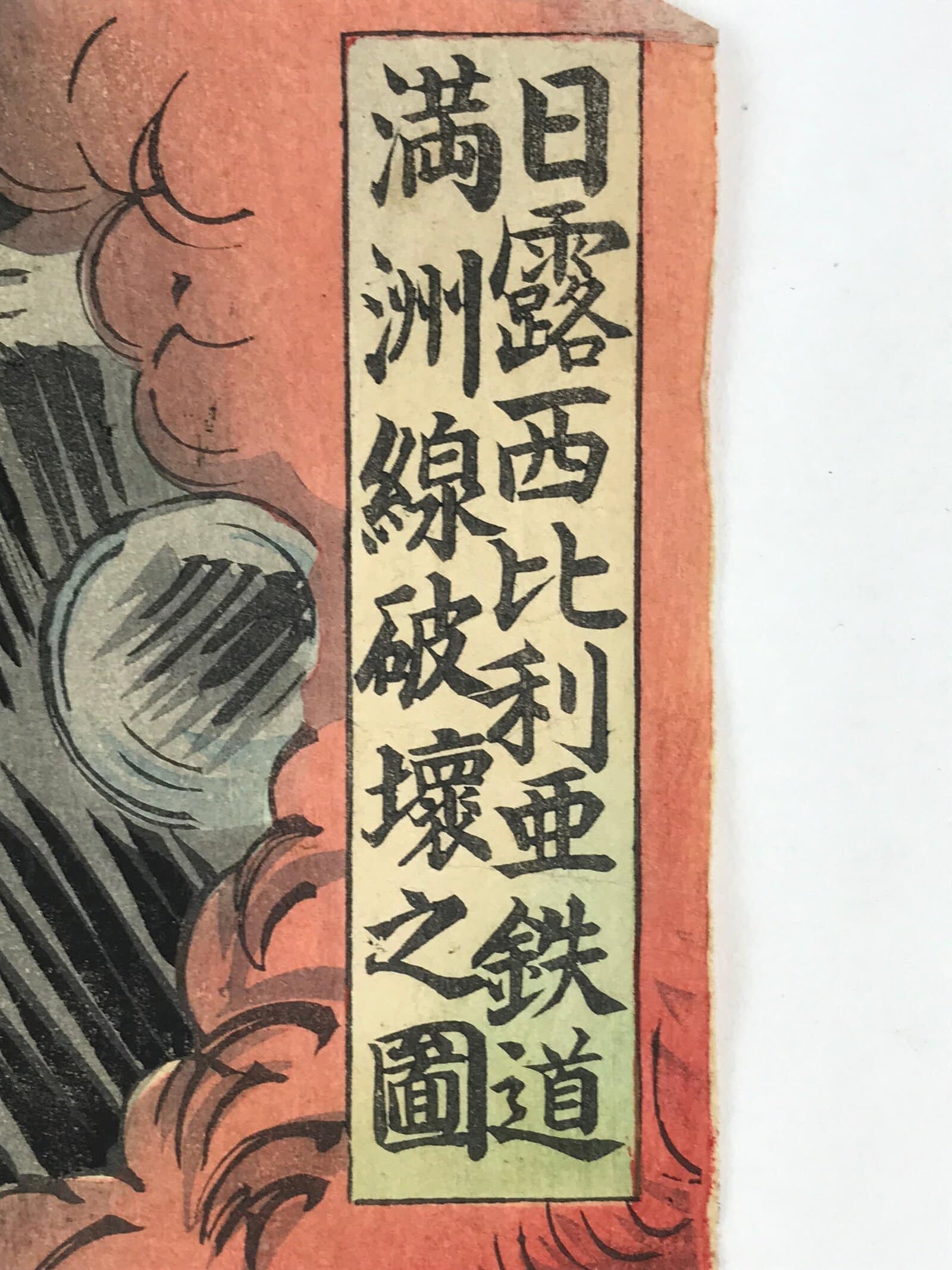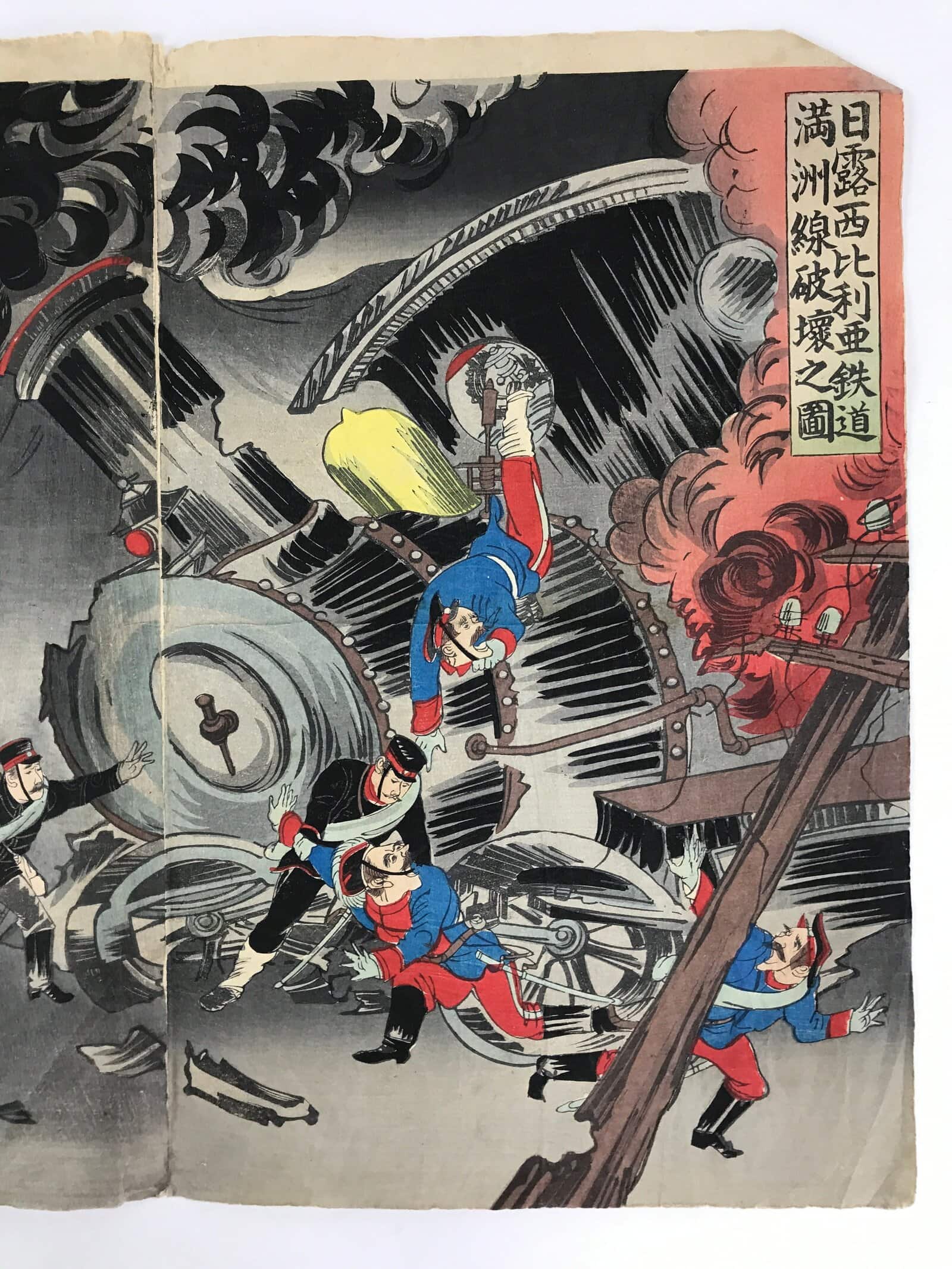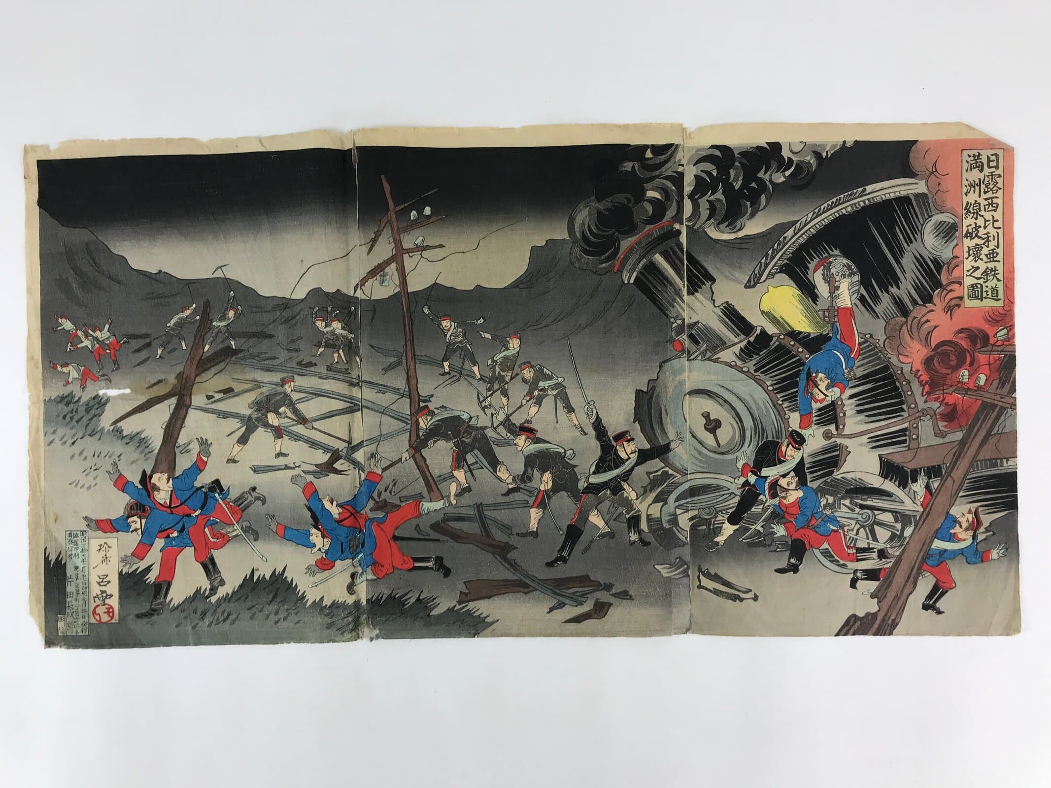 This is a Japanese woodblock print Ukiyoe by Rosetsu(呂雪). The kanji inscription says “Destroyed Manchurian Line of the Japan-Russia-West Asia Railway”(日露西比利亜鉄道満州線破壊之図). Ukiyoe is a genre of Japanese art that flourished from the 17th through 19th centuries. Its artists produced woodblock prints and paintings of such subjects as female beauties, kabuki actors and sumo wrestlers, scenes from history and folk tales, travel scenes and landscapes, flora and fauna, and erotica.