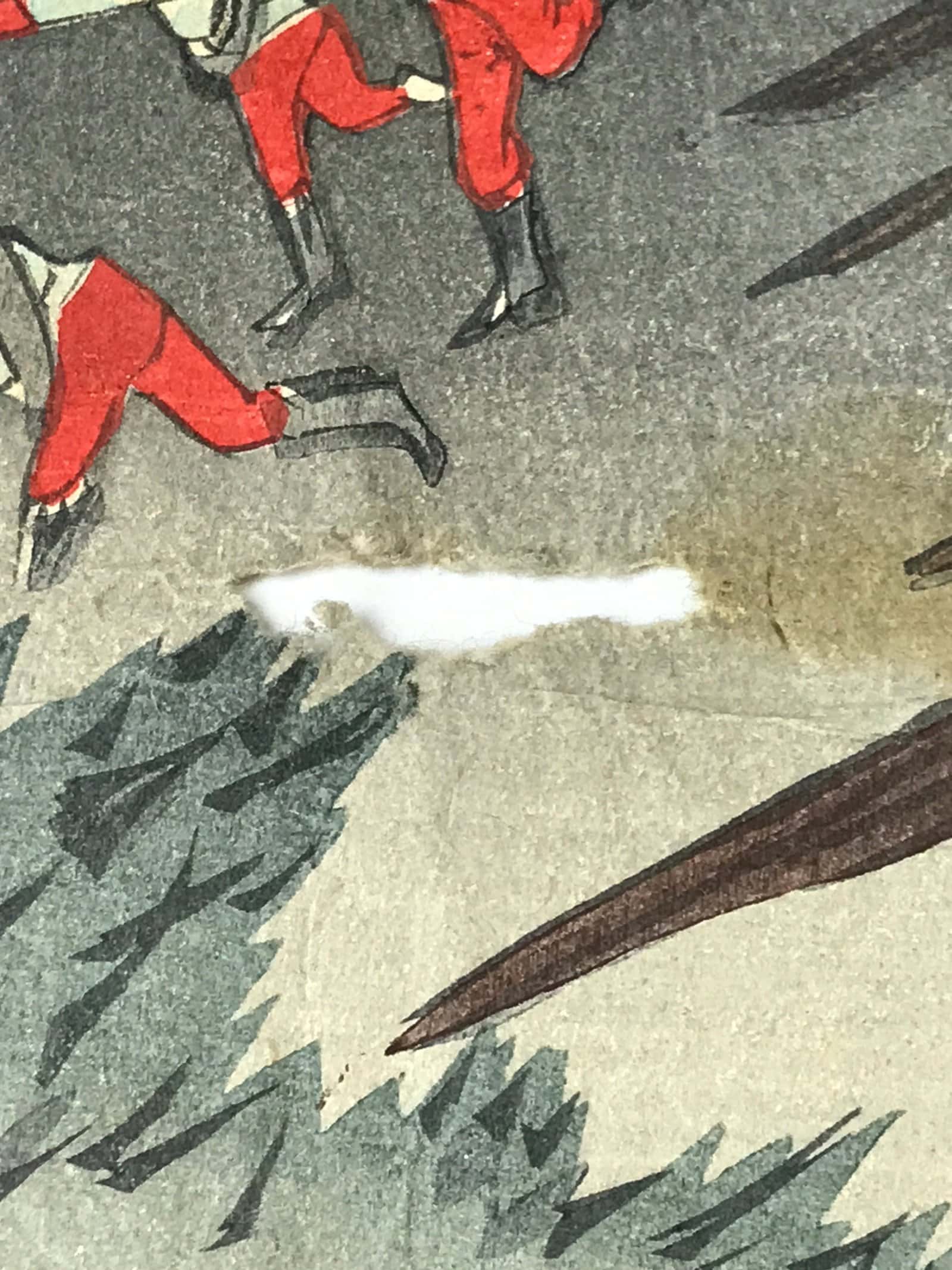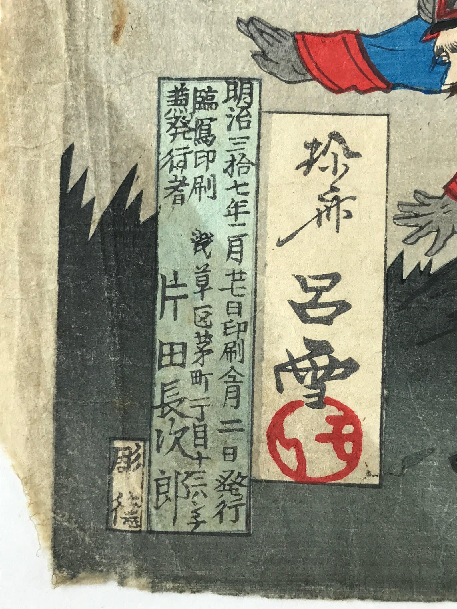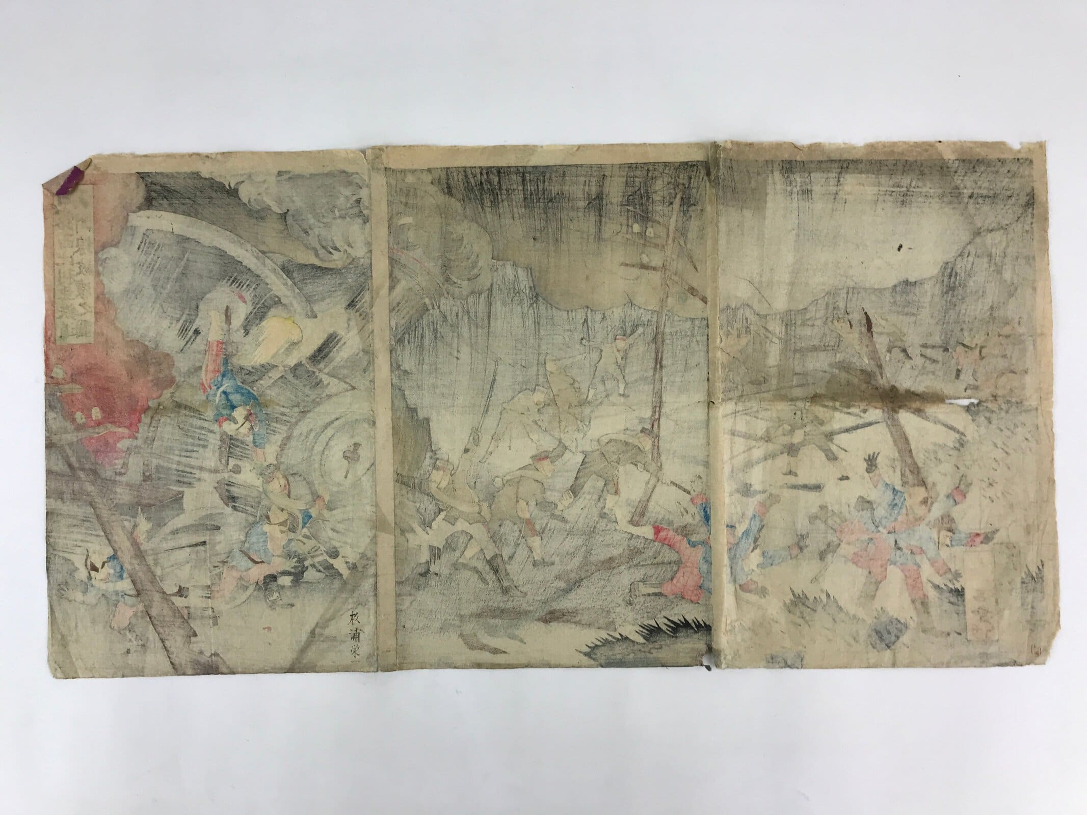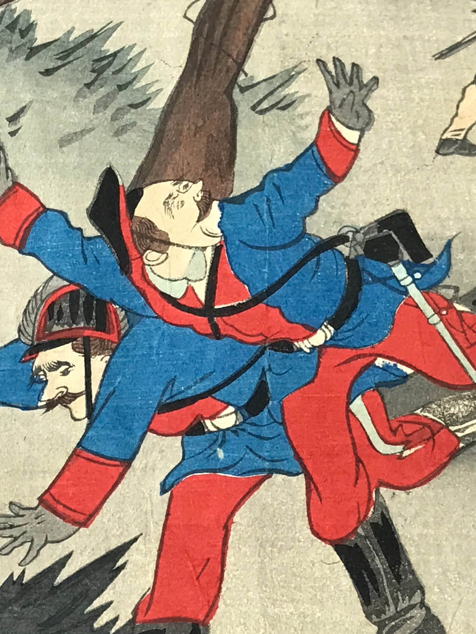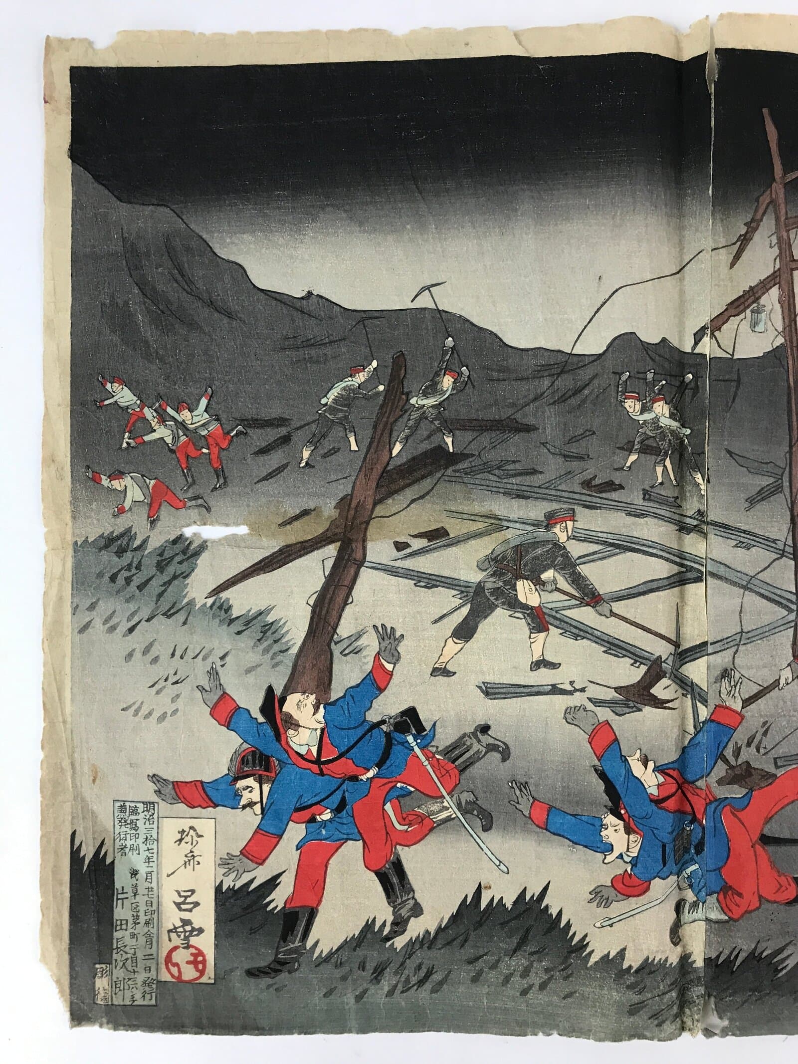This is a Japanese woodblock print Ukiyoe by Rosetsu(呂雪). The kanji inscription says “Destroyed Manchurian Line of the Japan-Russia-West Asia Railway”(日露西比利亜鉄道満州線破壊之図). Ukiyoe is a genre of Japanese art that flourished from the 17th through 19th centuries. Its artists produced woodblock prints and paintings of such subjects as female beauties, kabuki actors and sumo wrestlers, scenes from history and folk tales, travel scenes and landscapes, flora and fauna, and erotica.