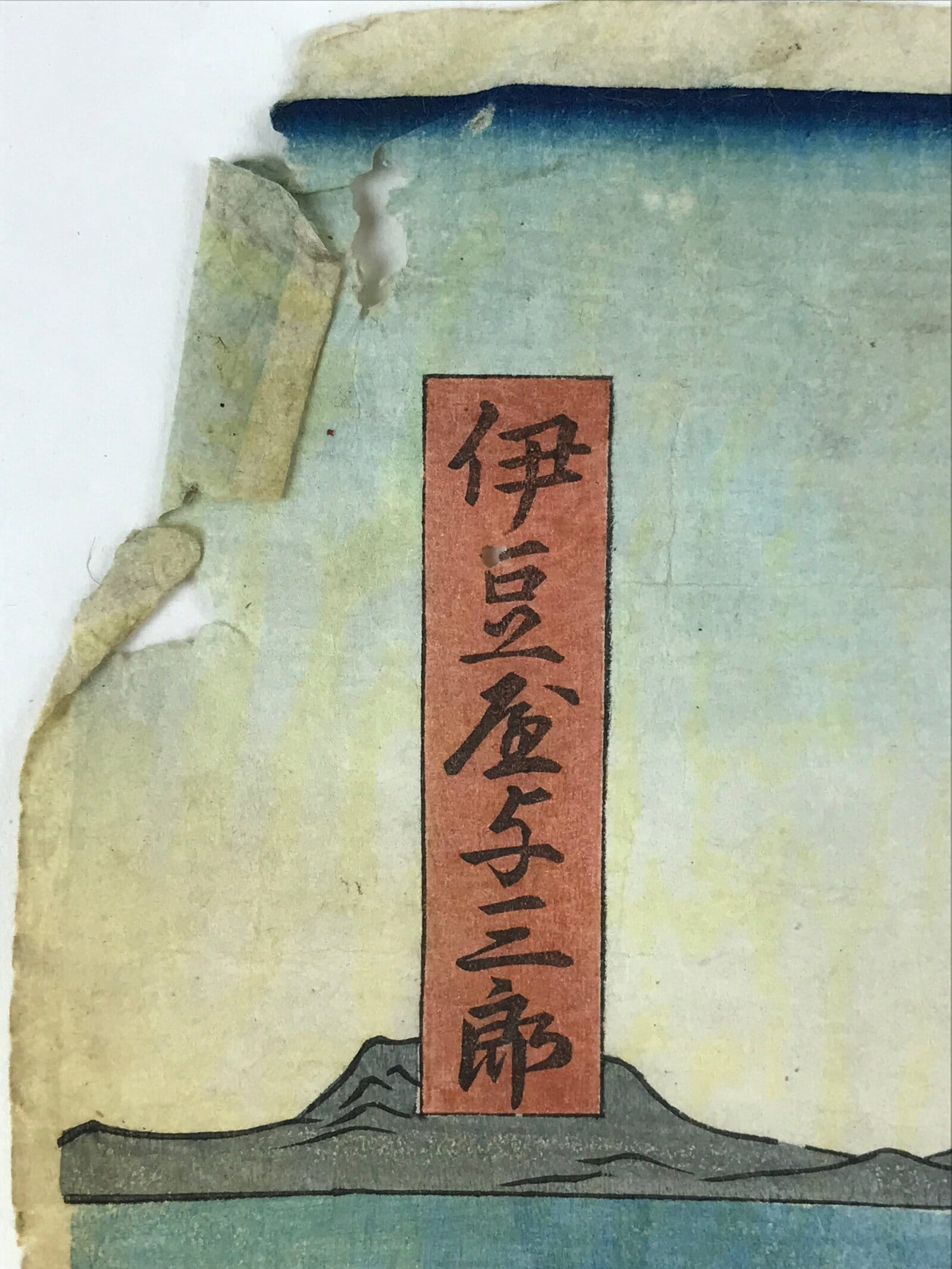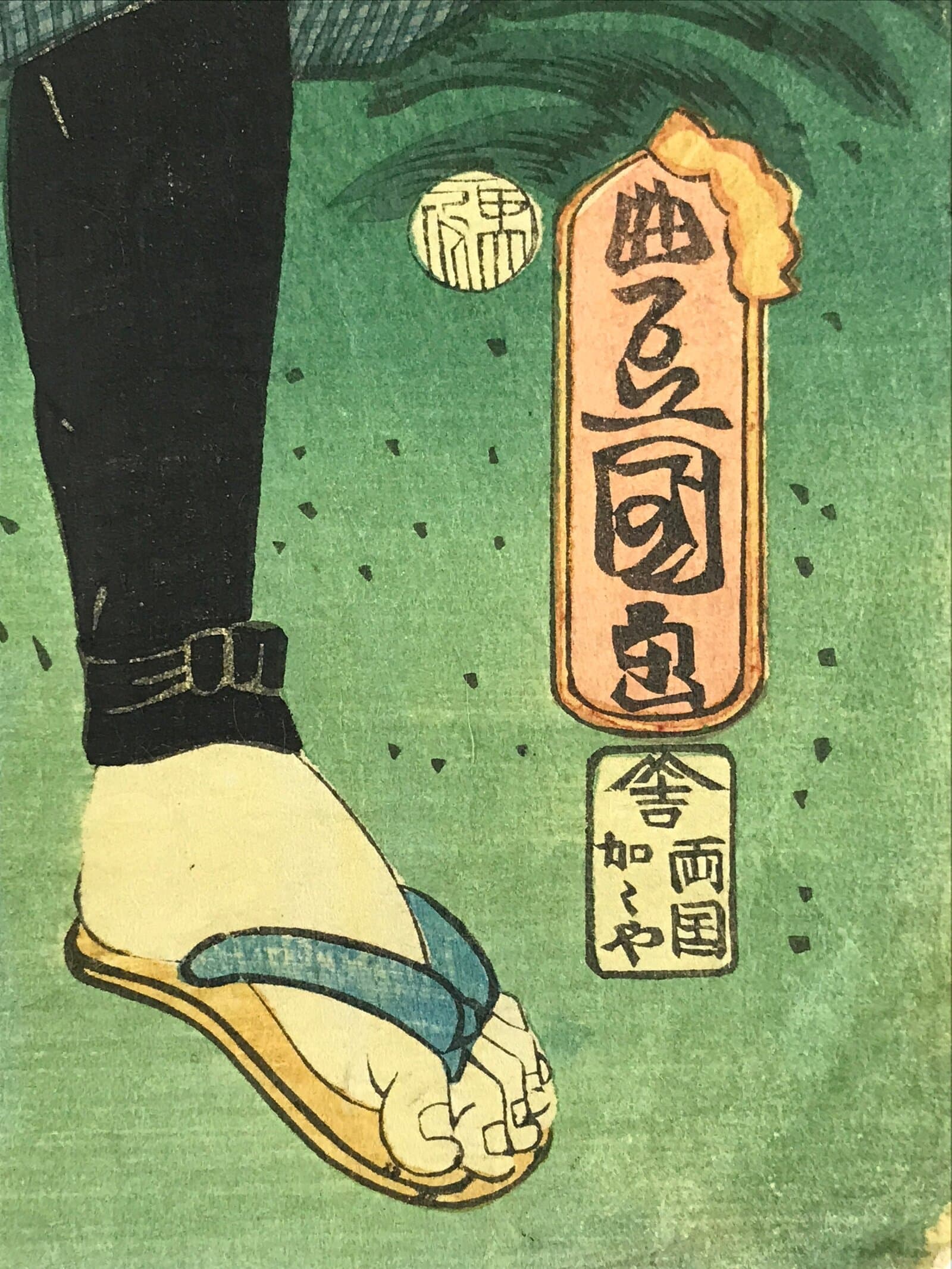 This is a Japanese woodblock print Ukiyoe by Yoshikazu Utagawa. The title of the kanji characters say Yosaburo Izuya(伊豆屋与三郎) . The man on the right name is Kingoro(金五郎). Ukiyoe is a genre of Japanese art that flourished from the 17th through 19th centuries. Its artists produced woodblock prints and paintings of such subjects as female beauties, kabuki actors and sumo wrestlers, scenes from history and folk tales, travel scenes and landscapes, flora and fauna, and erotica.