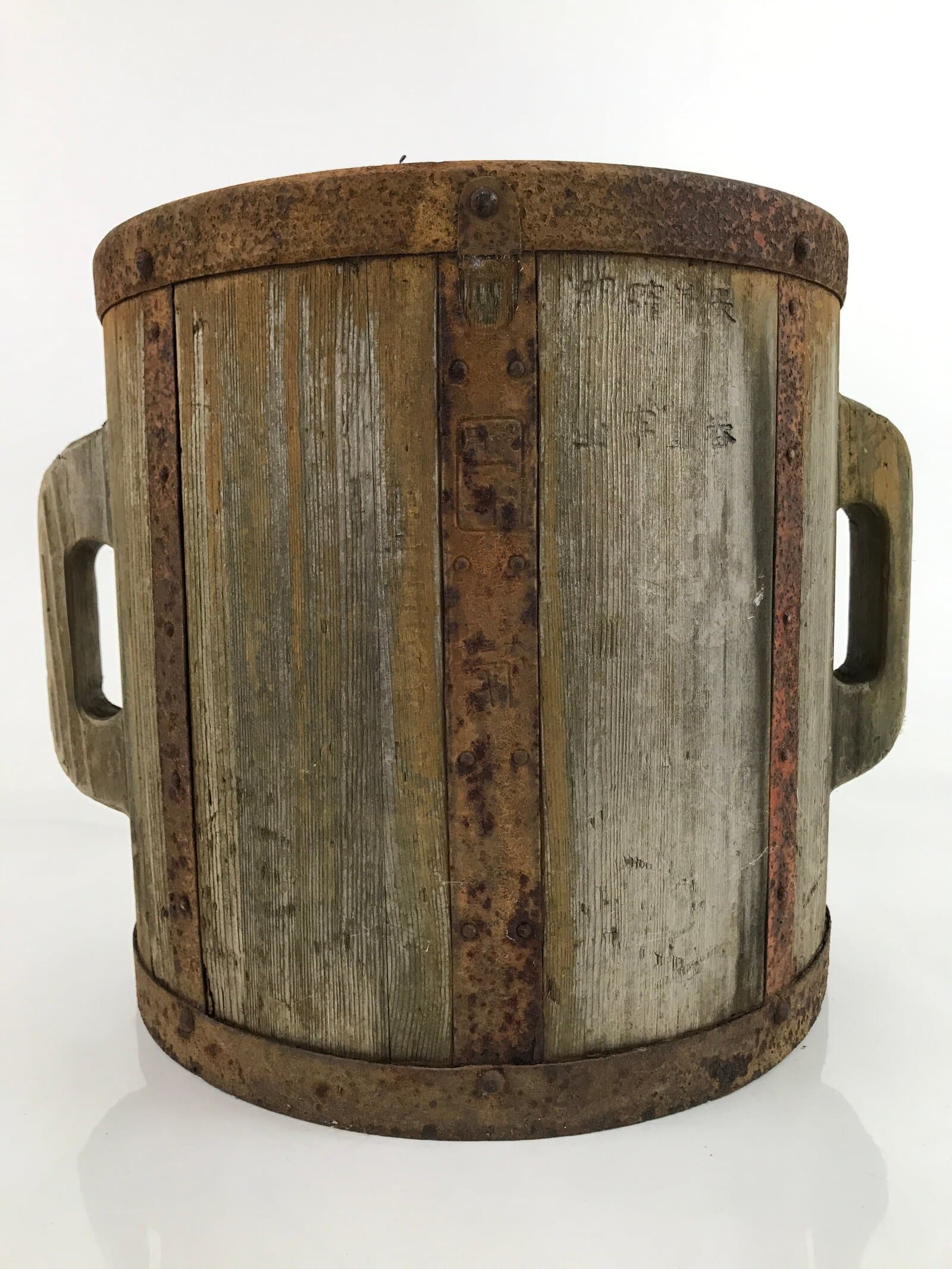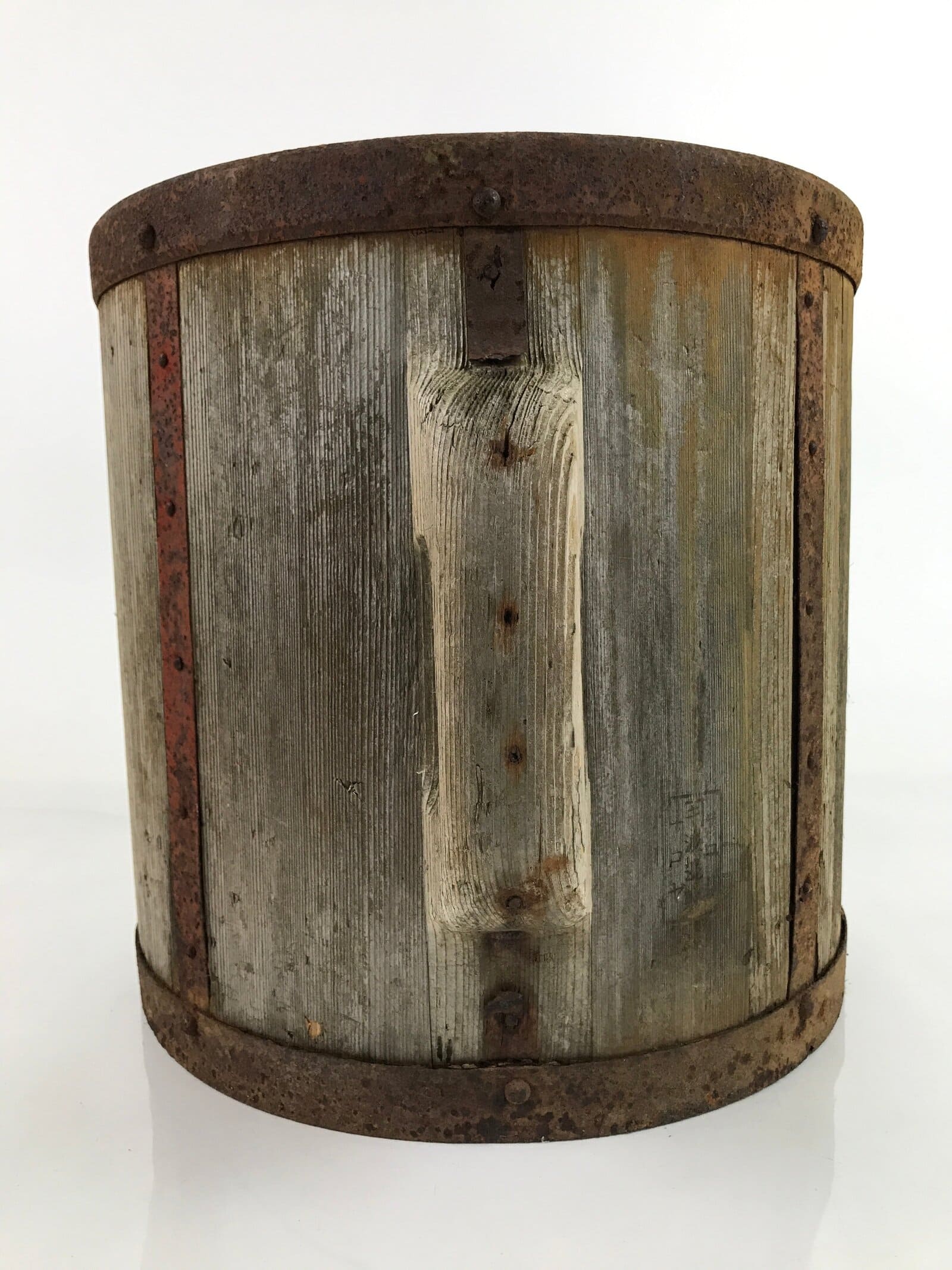 This traditional Japanese rice bucket, Masu or Ittomasu, was once used for measuring and storing units of rice (about 18L). Sturdy hardwood with iron holding it together, this bucket has two handles typically found on most masu.