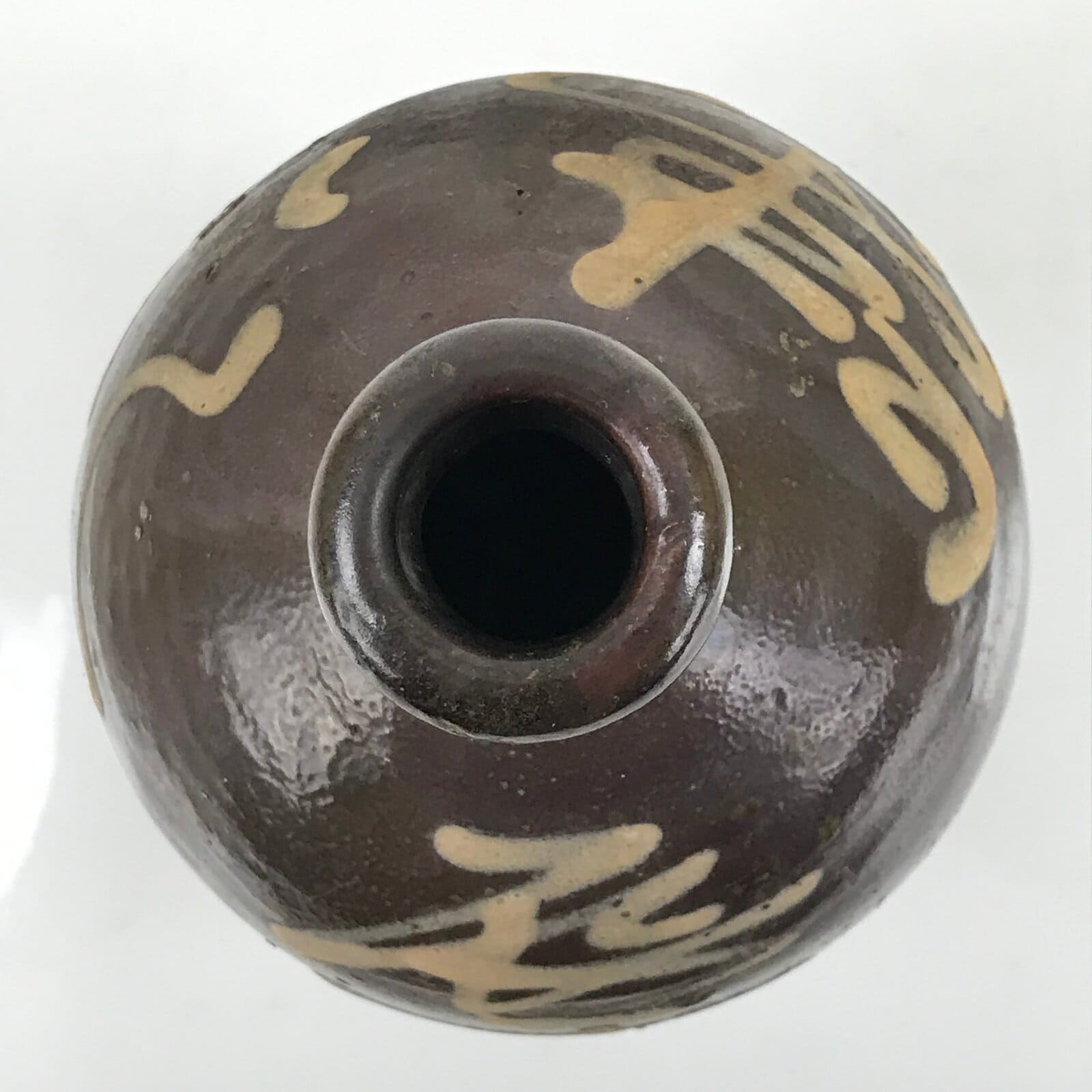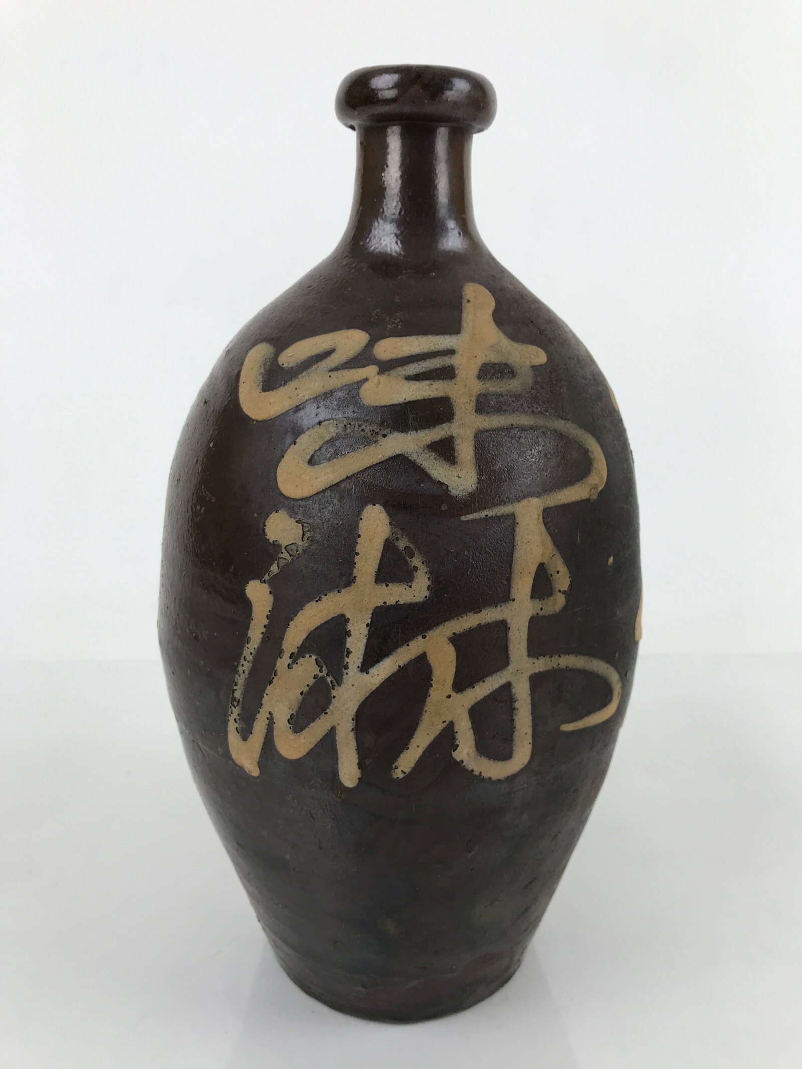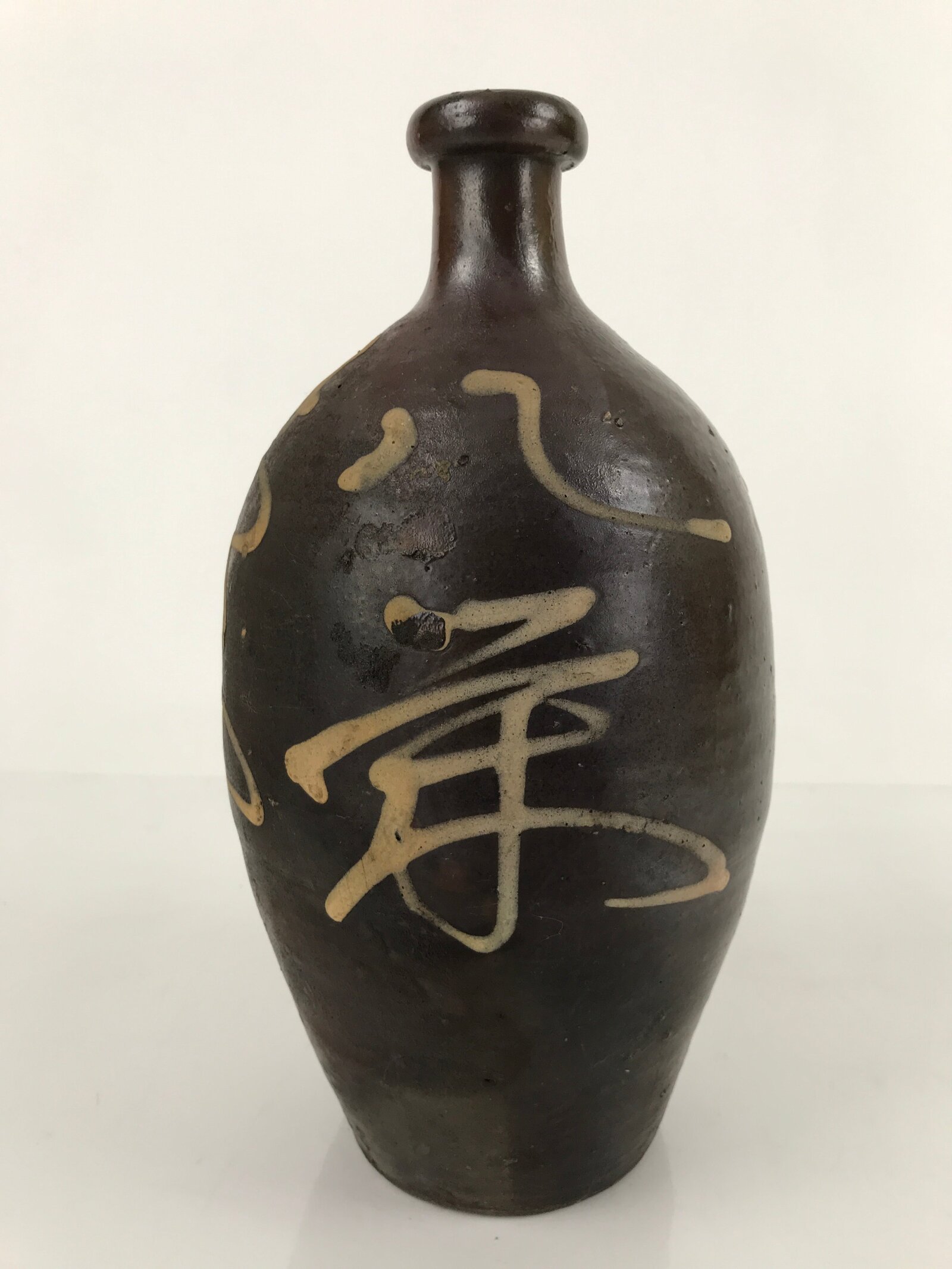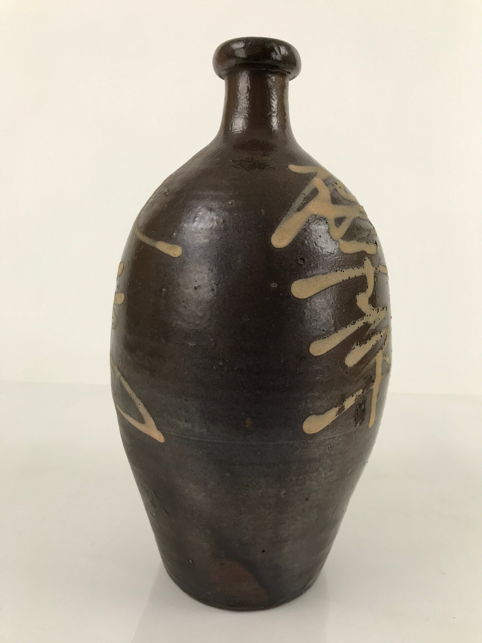 This is an antique Japanese ceramic sake bottle. It is called a Kayoi-Tokkuri and is used to pour sake. The commuting sake bottle became popular as a rental container for liquor stores in the Edo period when sake began to be consumed on a daily basis. This period bottle is brown with some white/beige Japanese kanji characters on the outside.