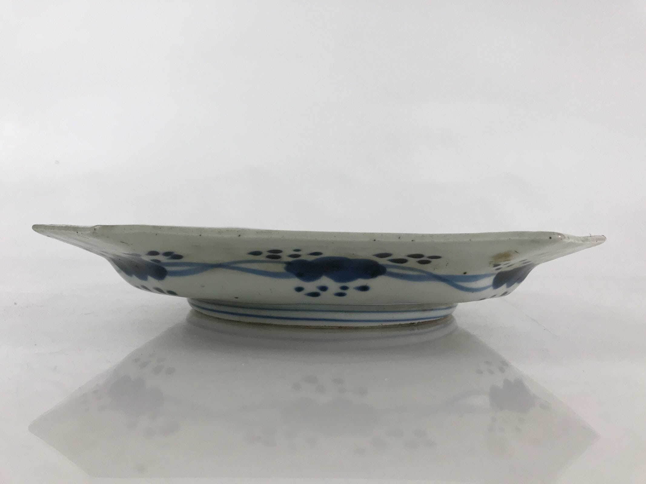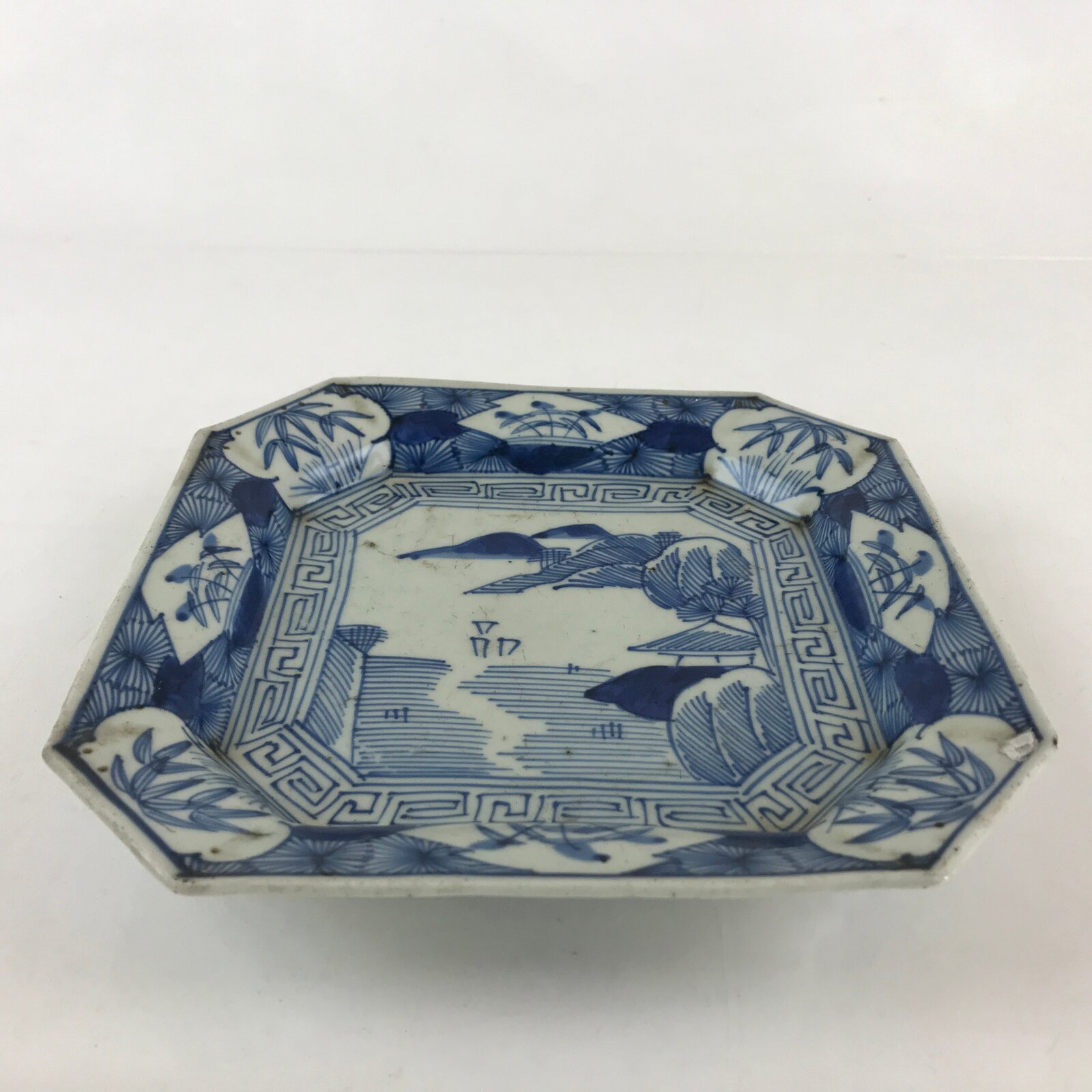 This is a Japanese antique C1900s porcelain plate, Sara. This plate has blue sometsuke mountains and river scenery design, Sansui. It is drawn by hand. It has distortion and sesame marks. Because it was fired with firewood instead of gas or electricity as it is today.
