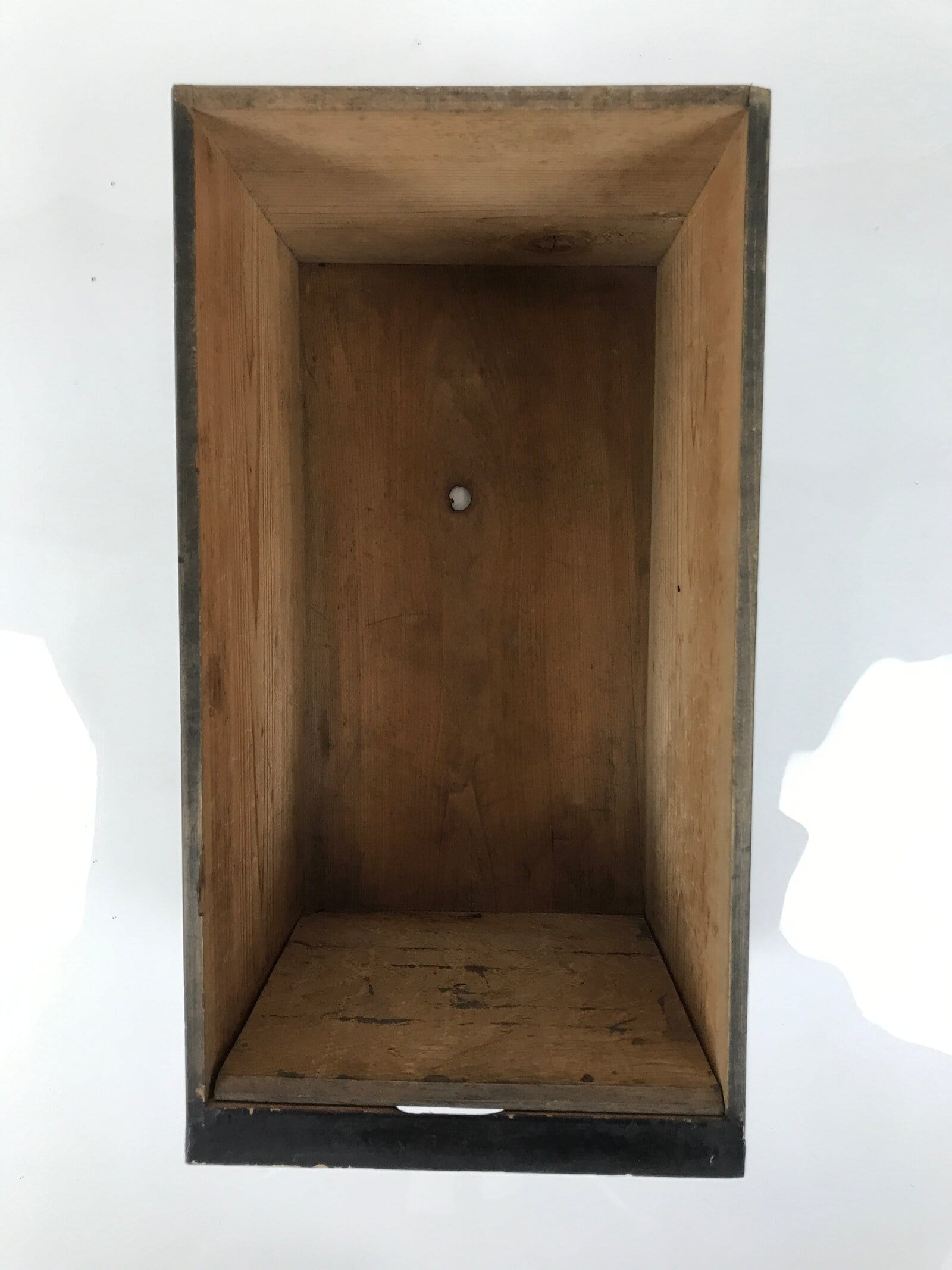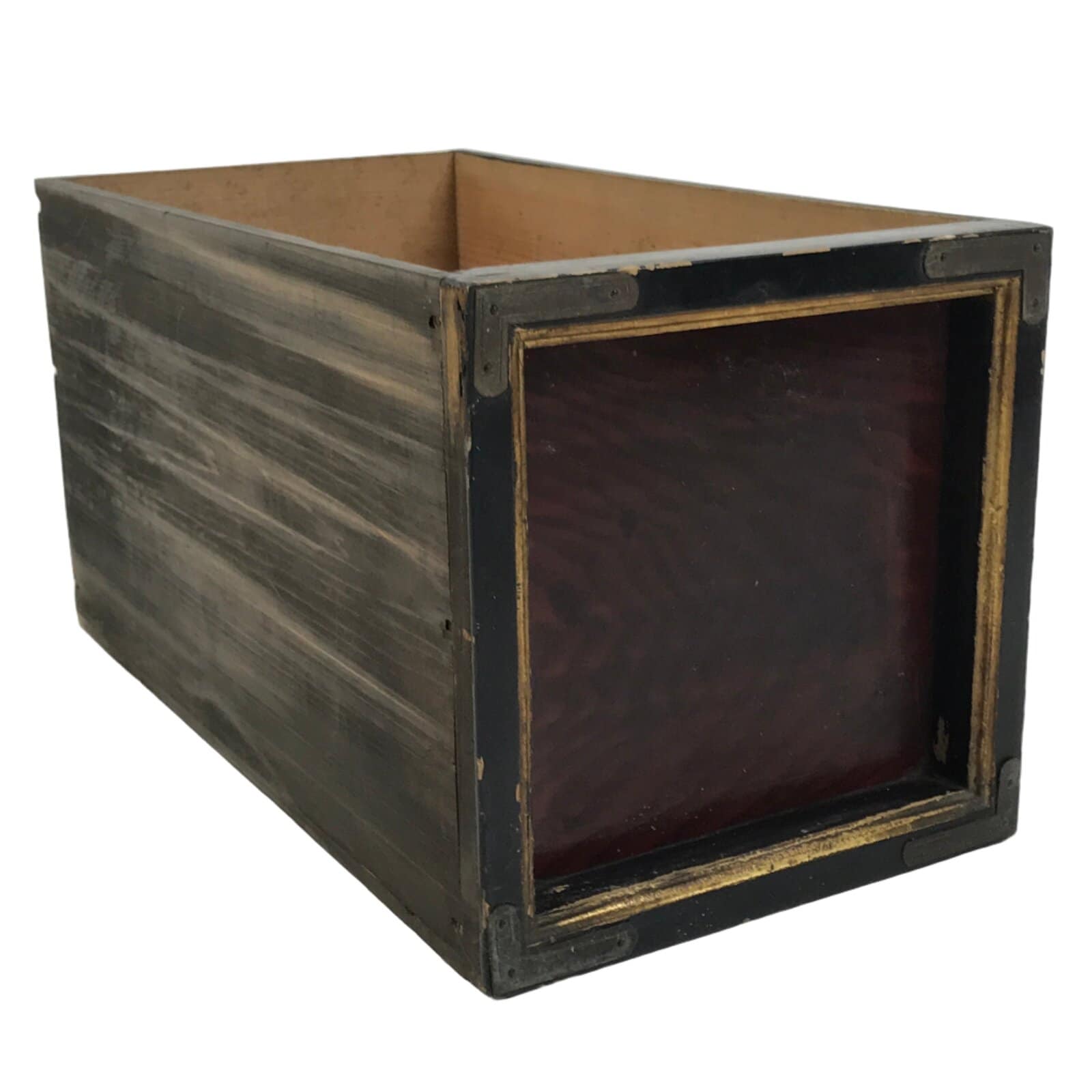 This item comes from an antique Japanese wooden Buddhist altar cabinet. This drawer is mostly coated in brown lacquer; the sides are matte, but the wooden grain can be seen through, and the front is glossy, though it is worn. The square front has a black frame with a drawer pull on the inside of the frame top. The black frame has gold embellishment and metal parts on the corners.