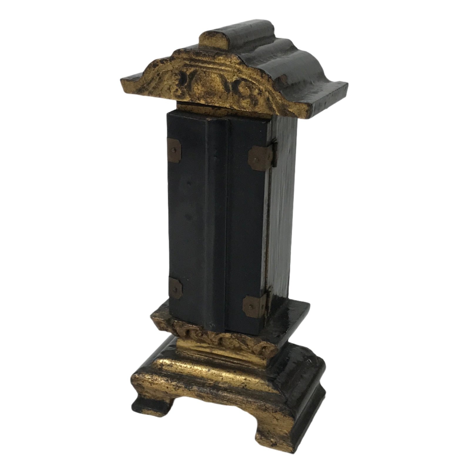 This is a small antique Japanese mortuary tablet Ihai. A mortuary tablet is a place the spirit of a deceased person is enshrined. This type of Ihai (with a double door) is called Miyabi. It is black with gold paint and brown metal embellishments. A mortuary tablet (Kai de Ihai) can hold several deceased people in one place (names written on wood plates). This particular mortuary tablet contains no wood plates inside.