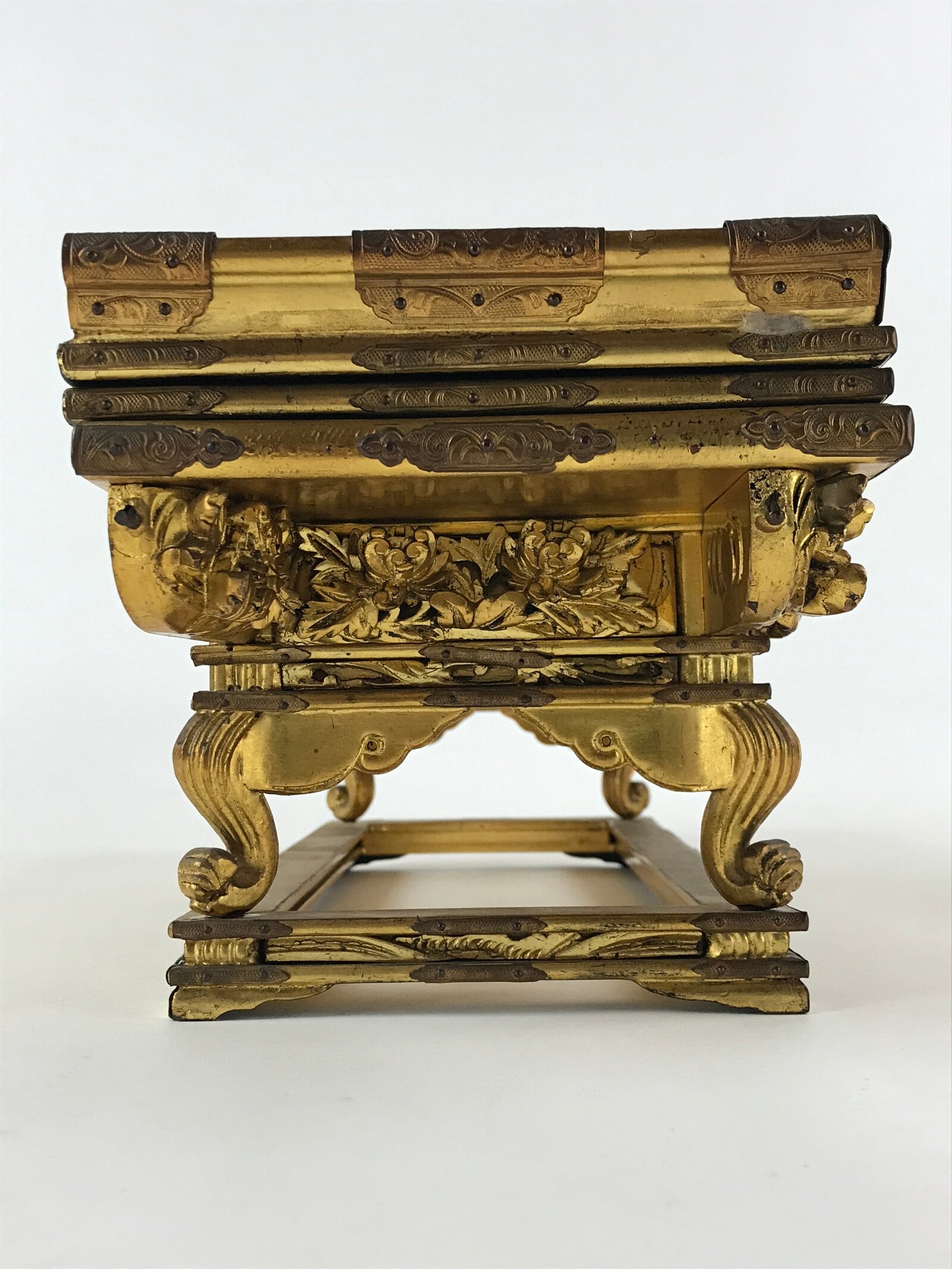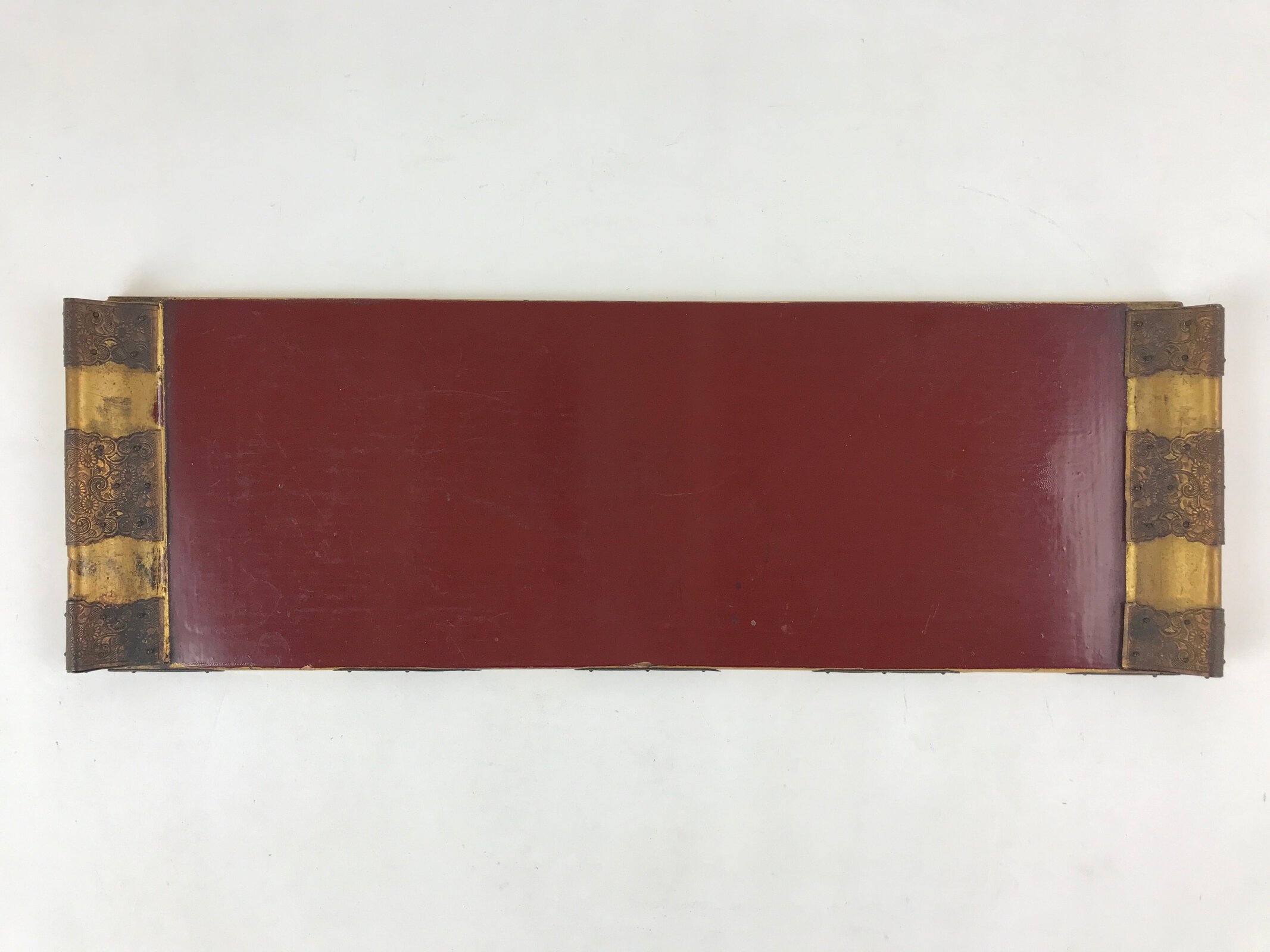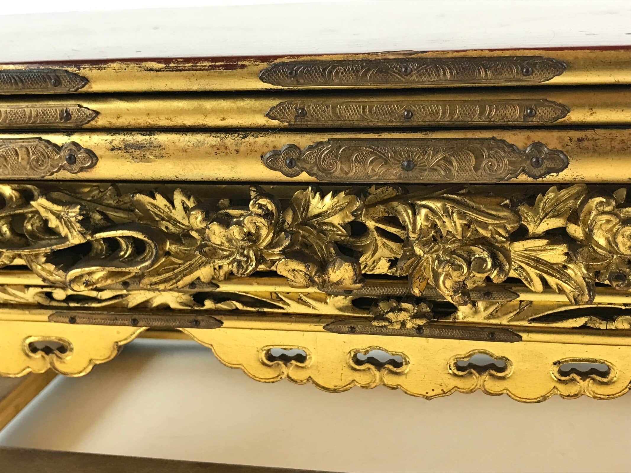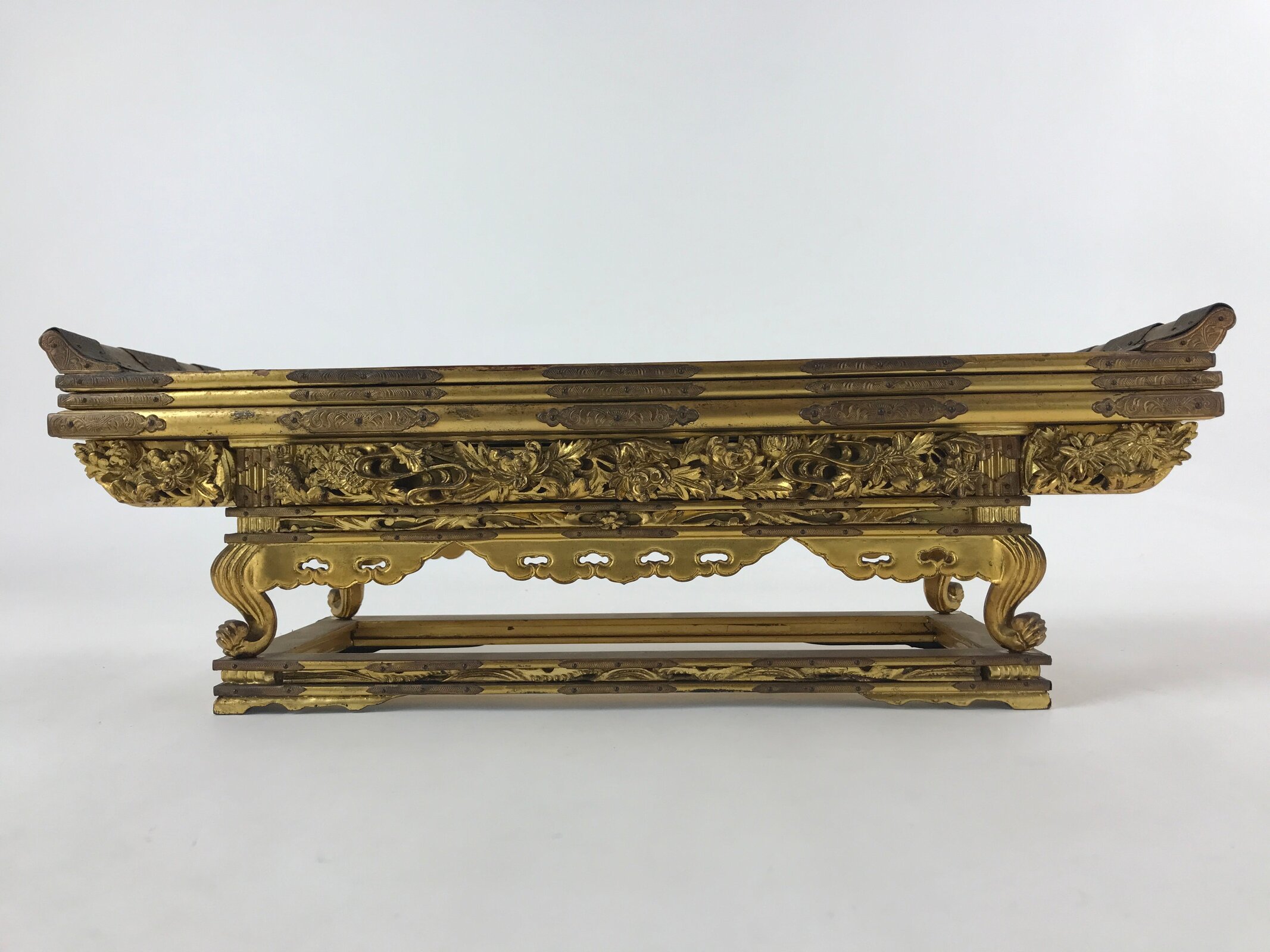 This is an antique Japanese Buddhist altar offering table (Maejyoku). It is coated with gold, red, and black lacquer. It contains two removable tabletop pieces. The edges are decorated with floral patterned bronze metal.