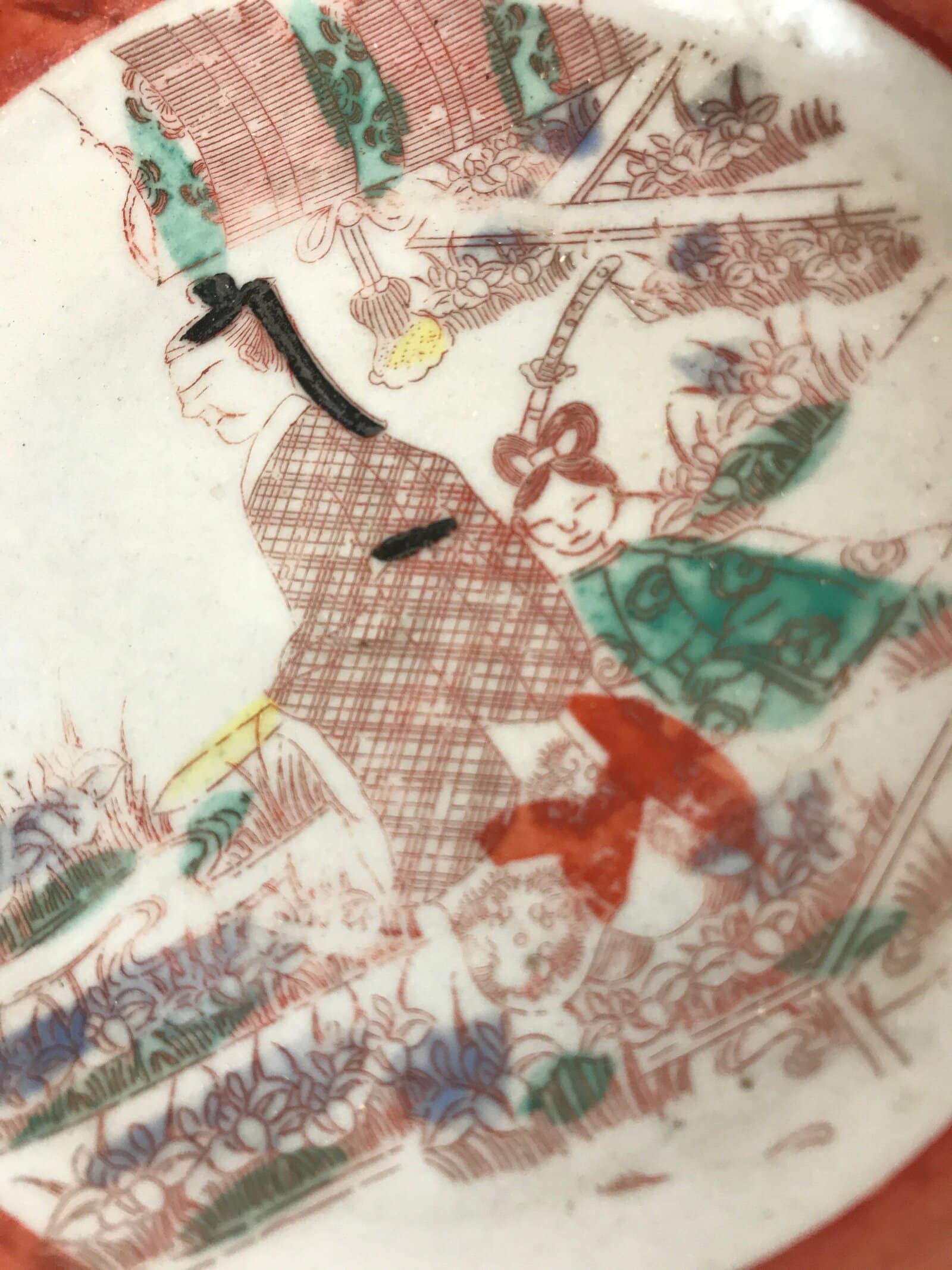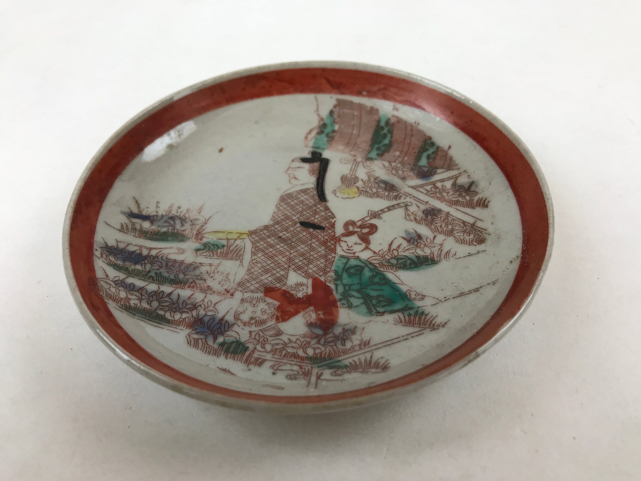 Antique Japanese Ceramic Plate Imari Akae Man Woman Garden Red Green PY614