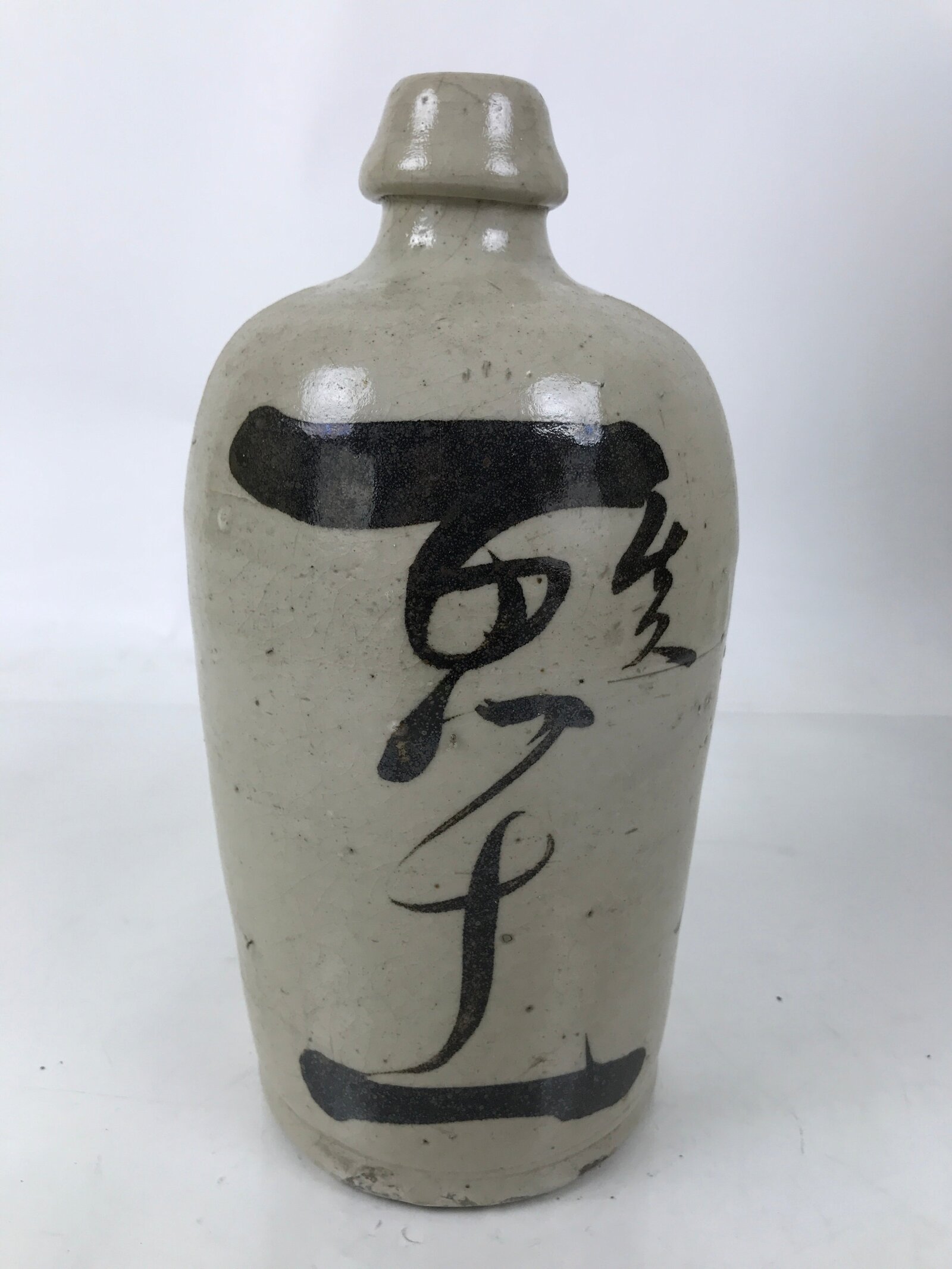 This is an antique Japanese ceramic sake bottle. It is called a Kayoi-Tokkuri and is used to pour sake. The commuting sake bottle became popular as a rental container for liquor stores in the Edo period when sake began to be consumed daily. This gray bottle has black characters and crackle glaze Kannyu on the body.