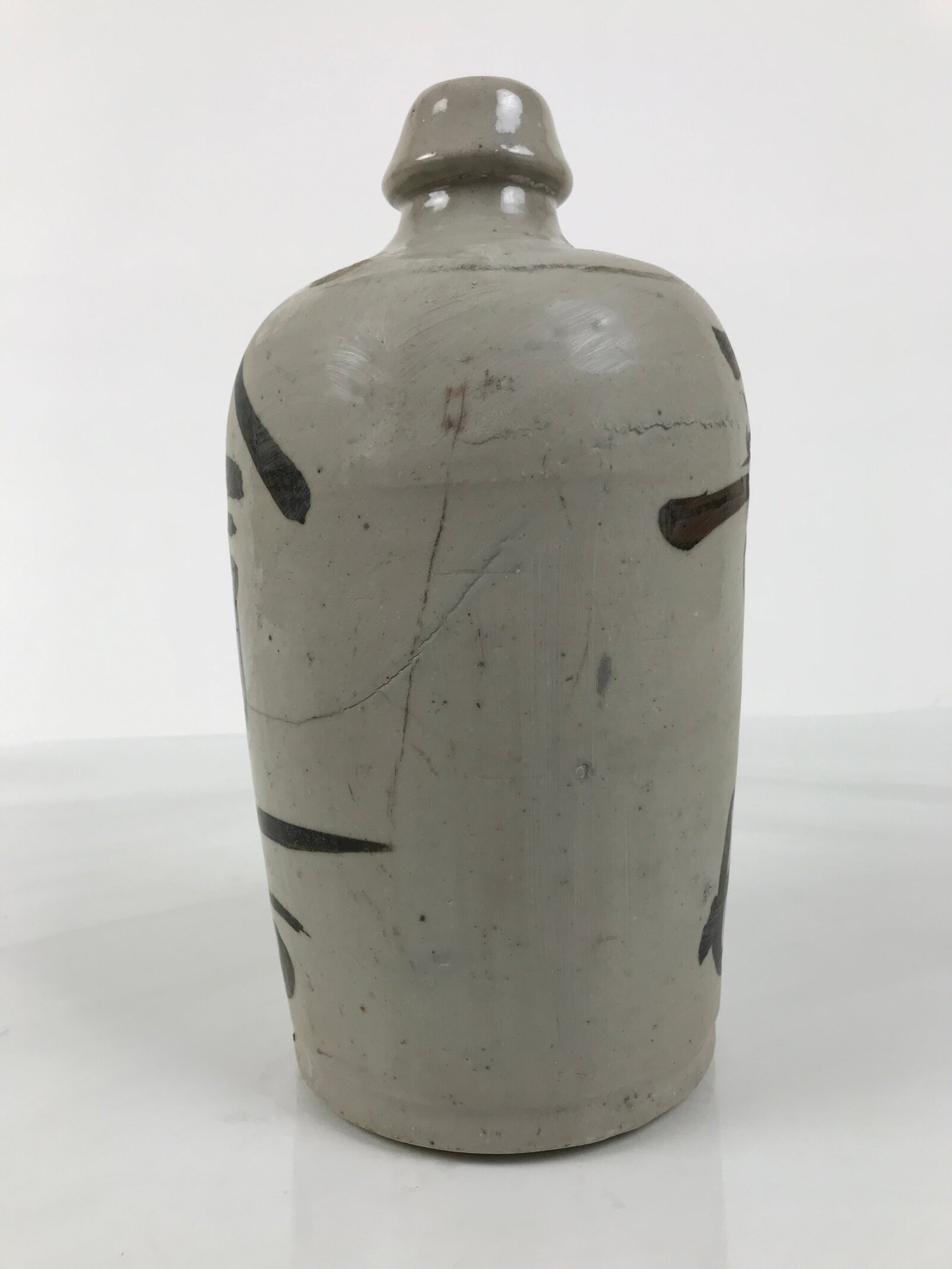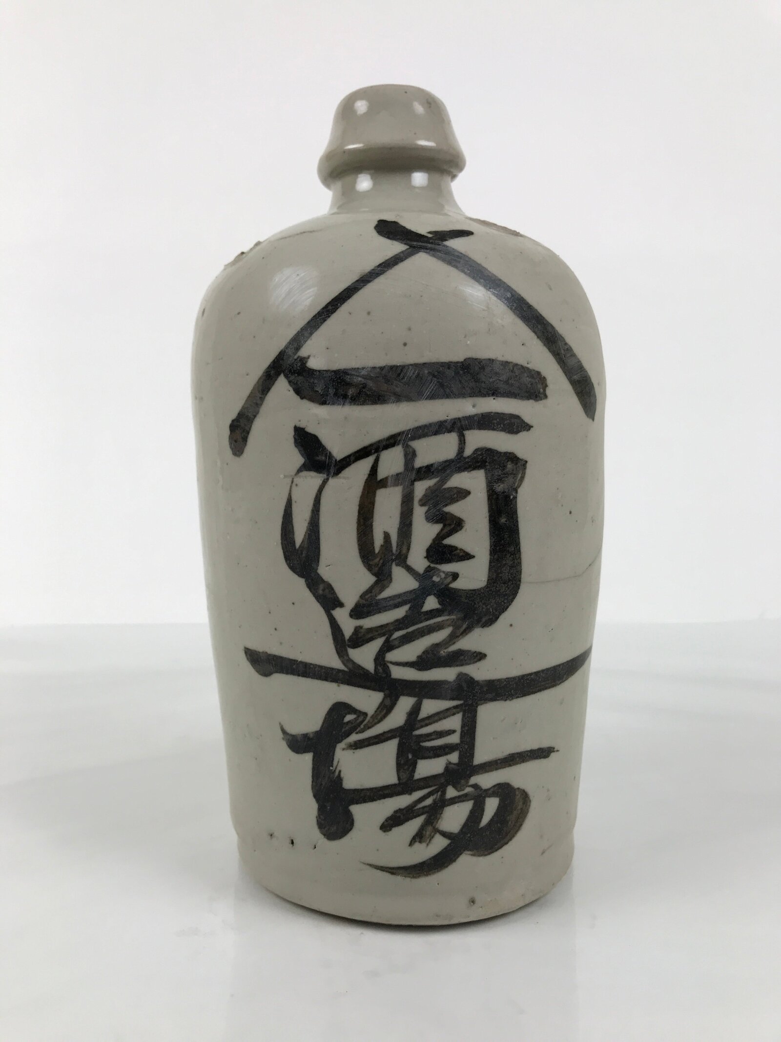 This is an antique Japanese ceramic sake bottle. It is called a Kayoi-Tokkuri and is used to pour sake. The commuting sake bottle became popular as a rental container for liquor stores in the Edo period when sake began to be consumed daily. This gray bottle has brown characters.