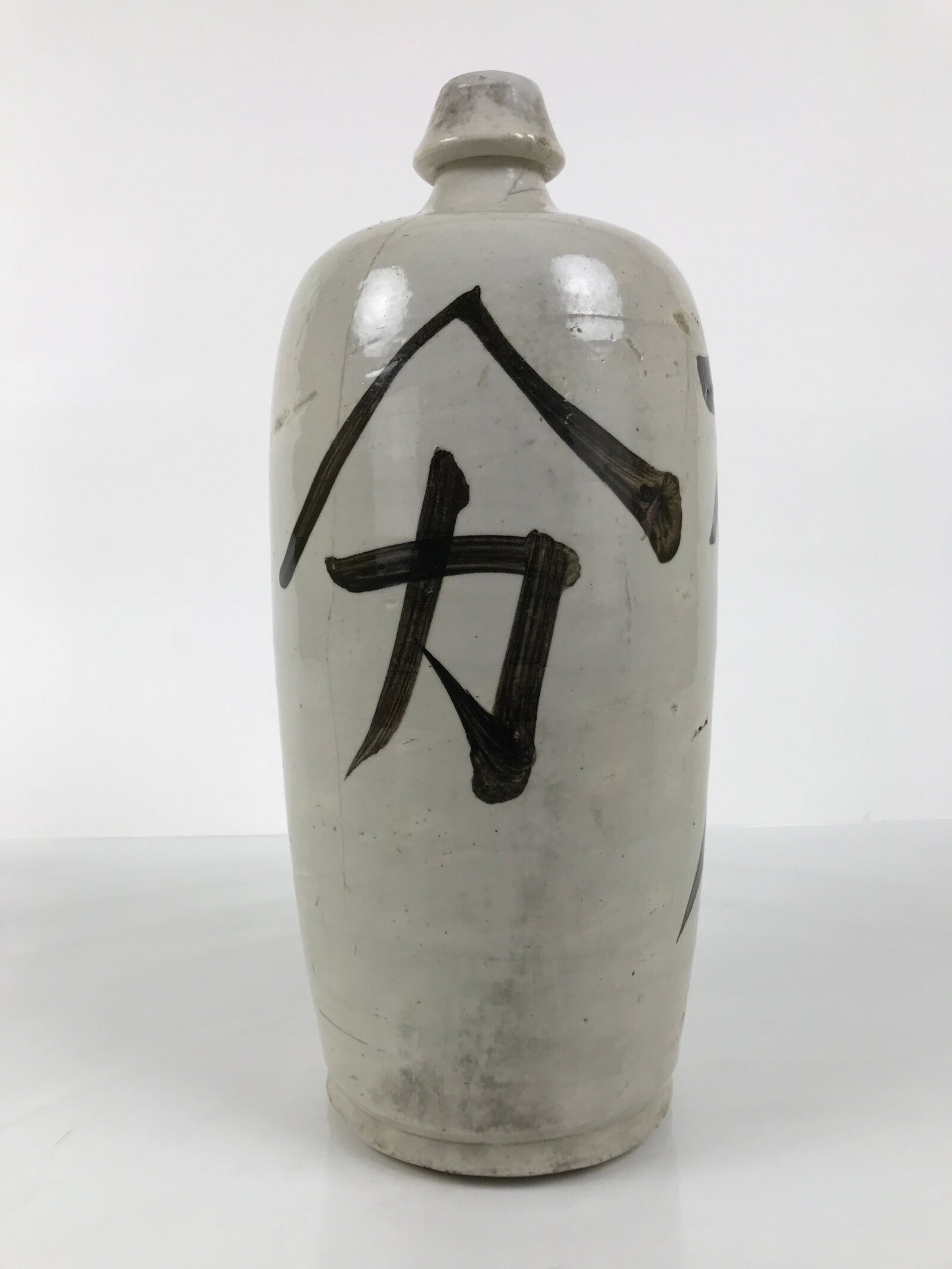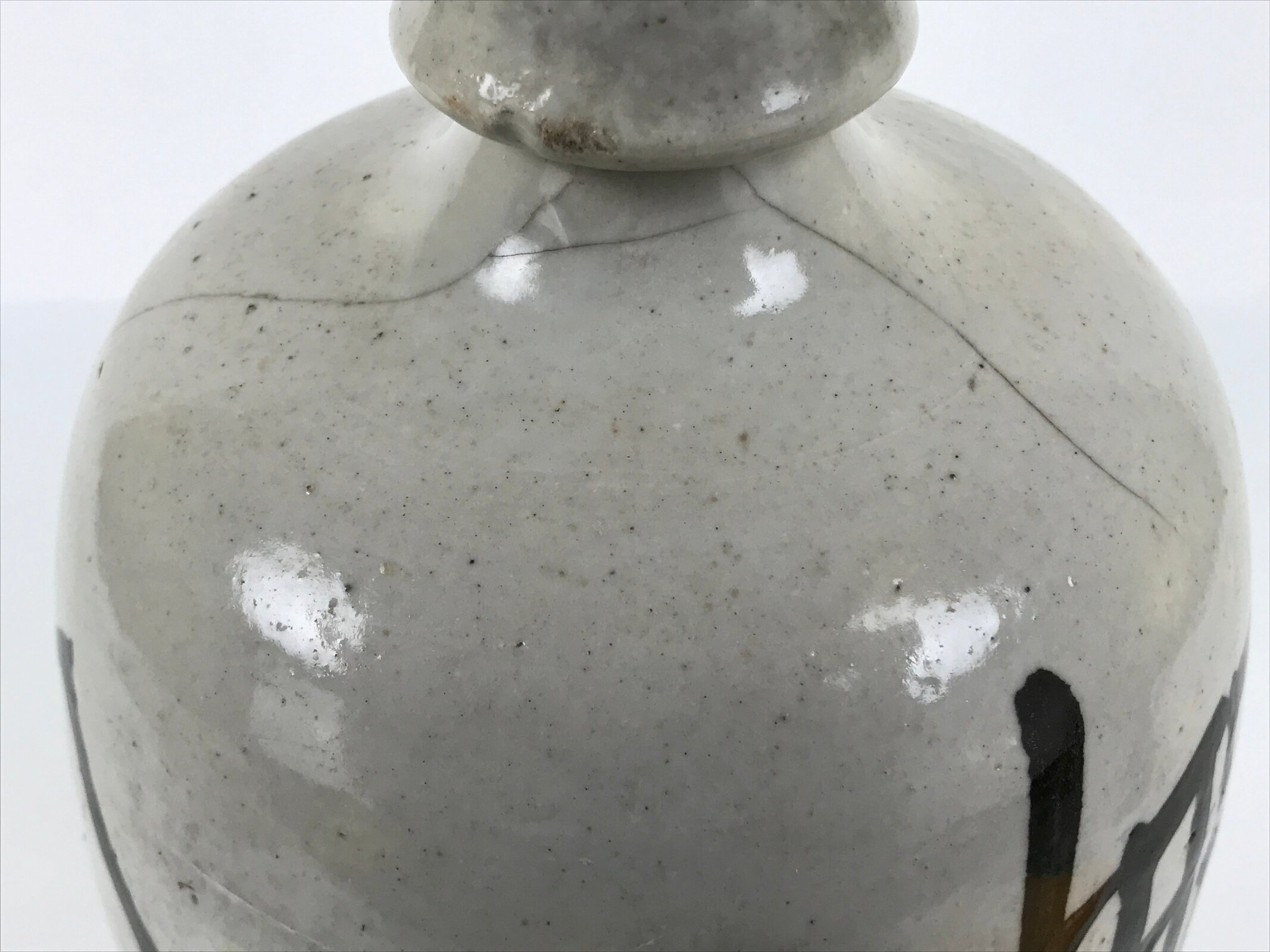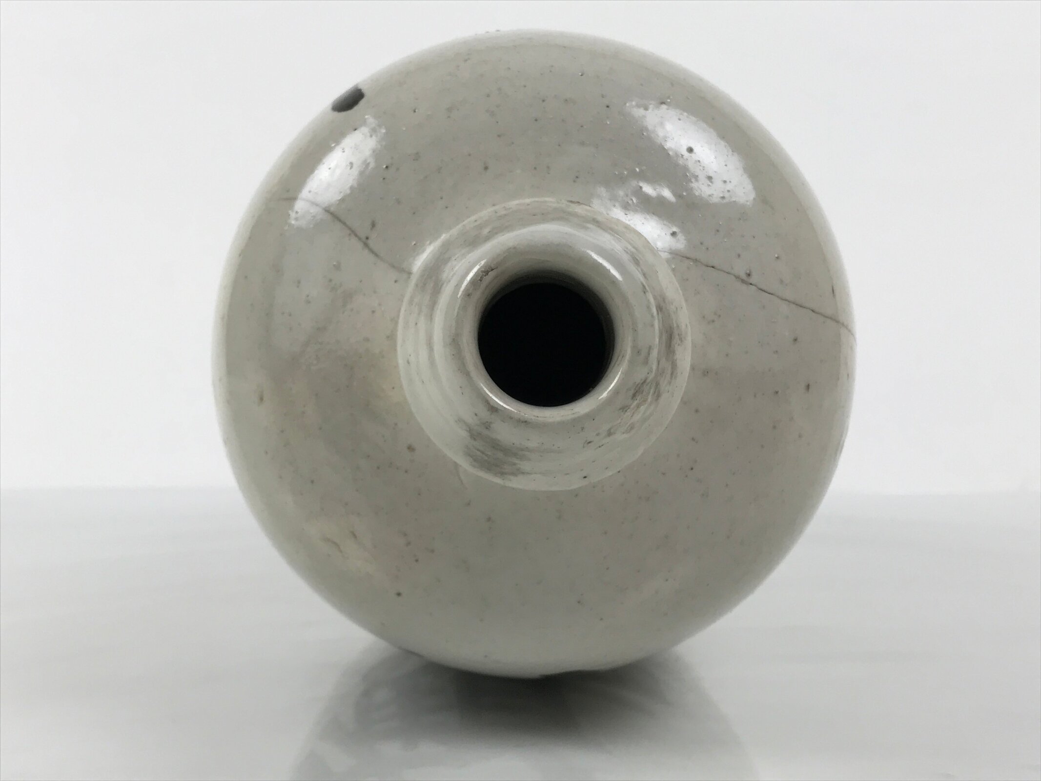 This is an antique Japanese ceramic sake bottle. It is called a Kayoi-Tokkuri and is used to pour sake. The commuting sake bottle became popular as a rental container for liquor stores in the Edo period, when sake began to be consumed daily. This gray bottle has black characters.