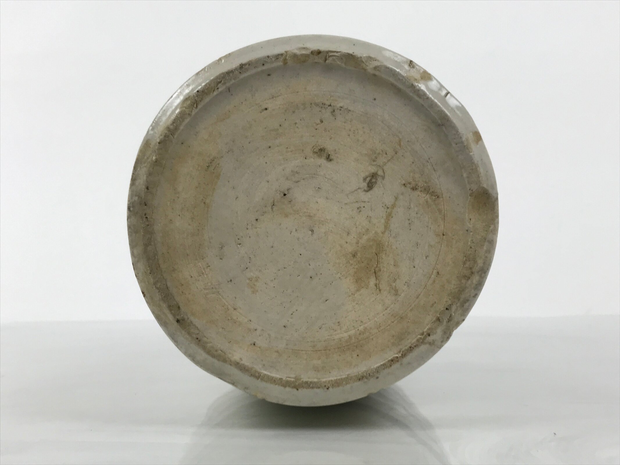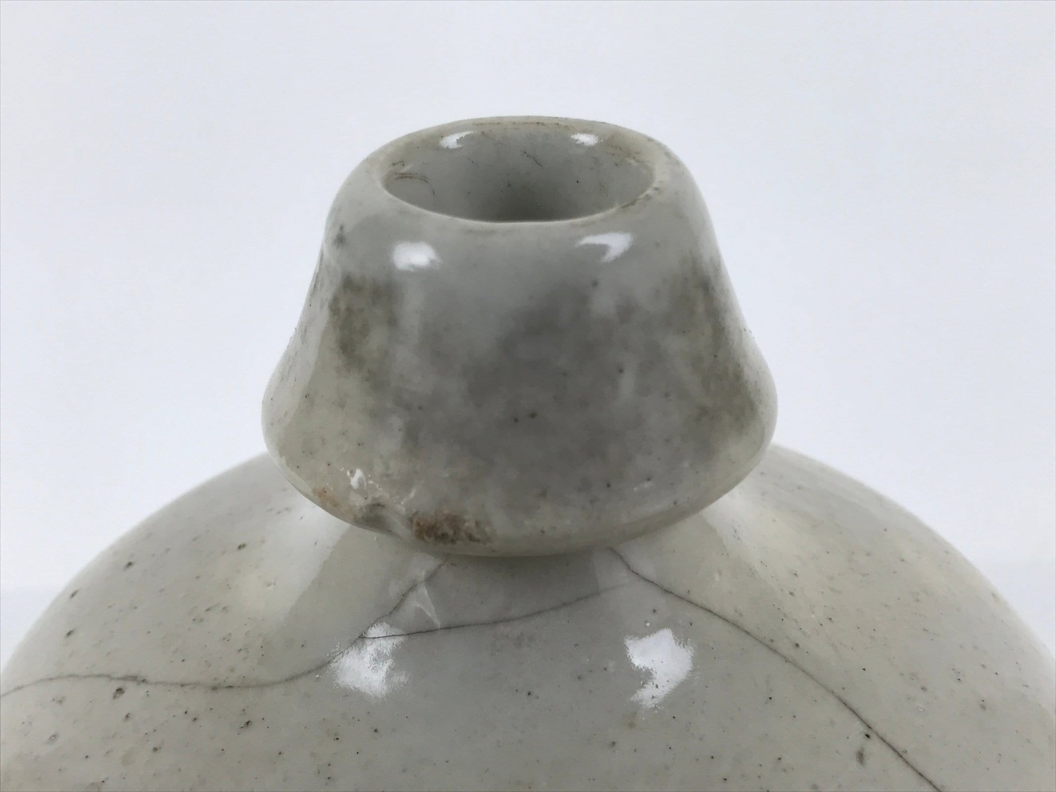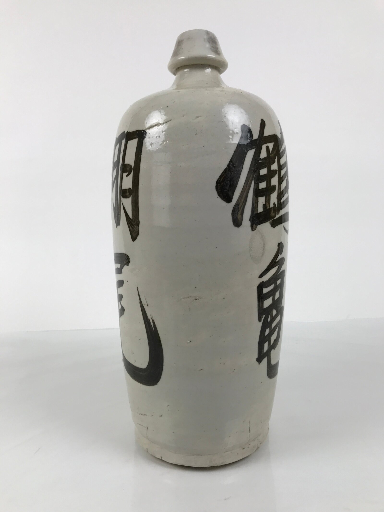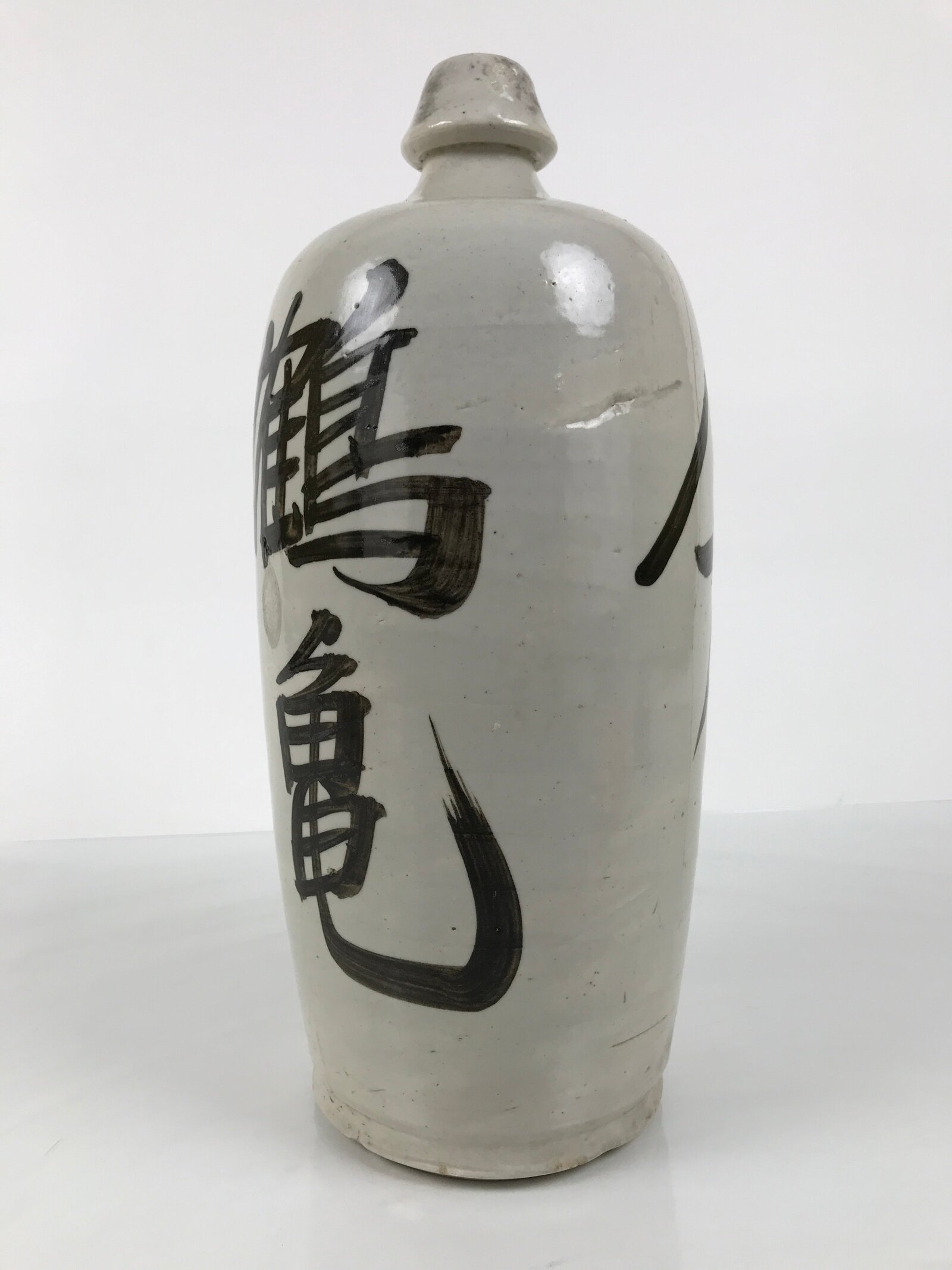 This is an antique Japanese ceramic sake bottle. It is called a Kayoi-Tokkuri and is used to pour sake. The commuting sake bottle became popular as a rental container for liquor stores in the Edo period, when sake began to be consumed daily. This gray bottle has black characters.