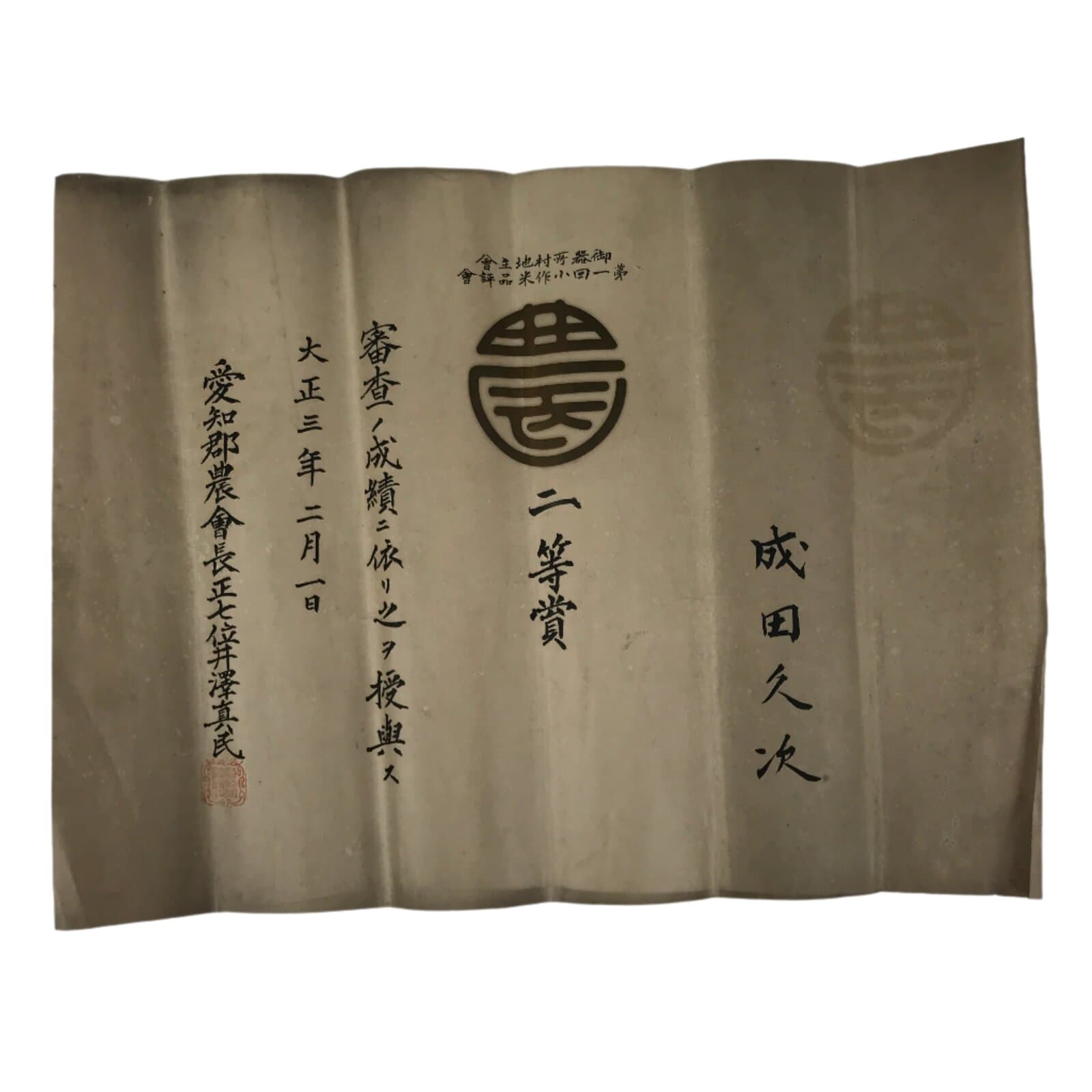 This antique Japanese award certificate, dated Taisho 3 (1914), was given to a tenant farmer who managed rice fields for the quality of the rice produced.