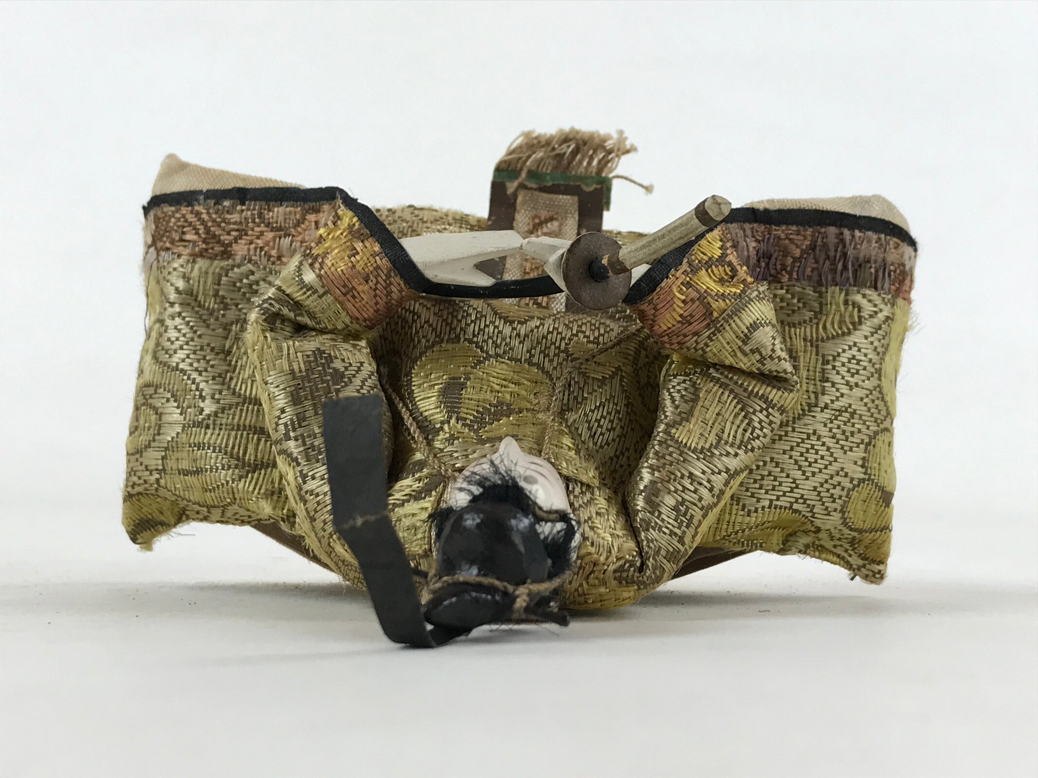 This handsome antique prince ohinasama doll decorated in green silk is the perfect addition to any existing hina set or to add gorgeous Eastern flair to any home decor. He has a sword on his hands and sits on a wooden platform adorned with a gold floral design on the front.