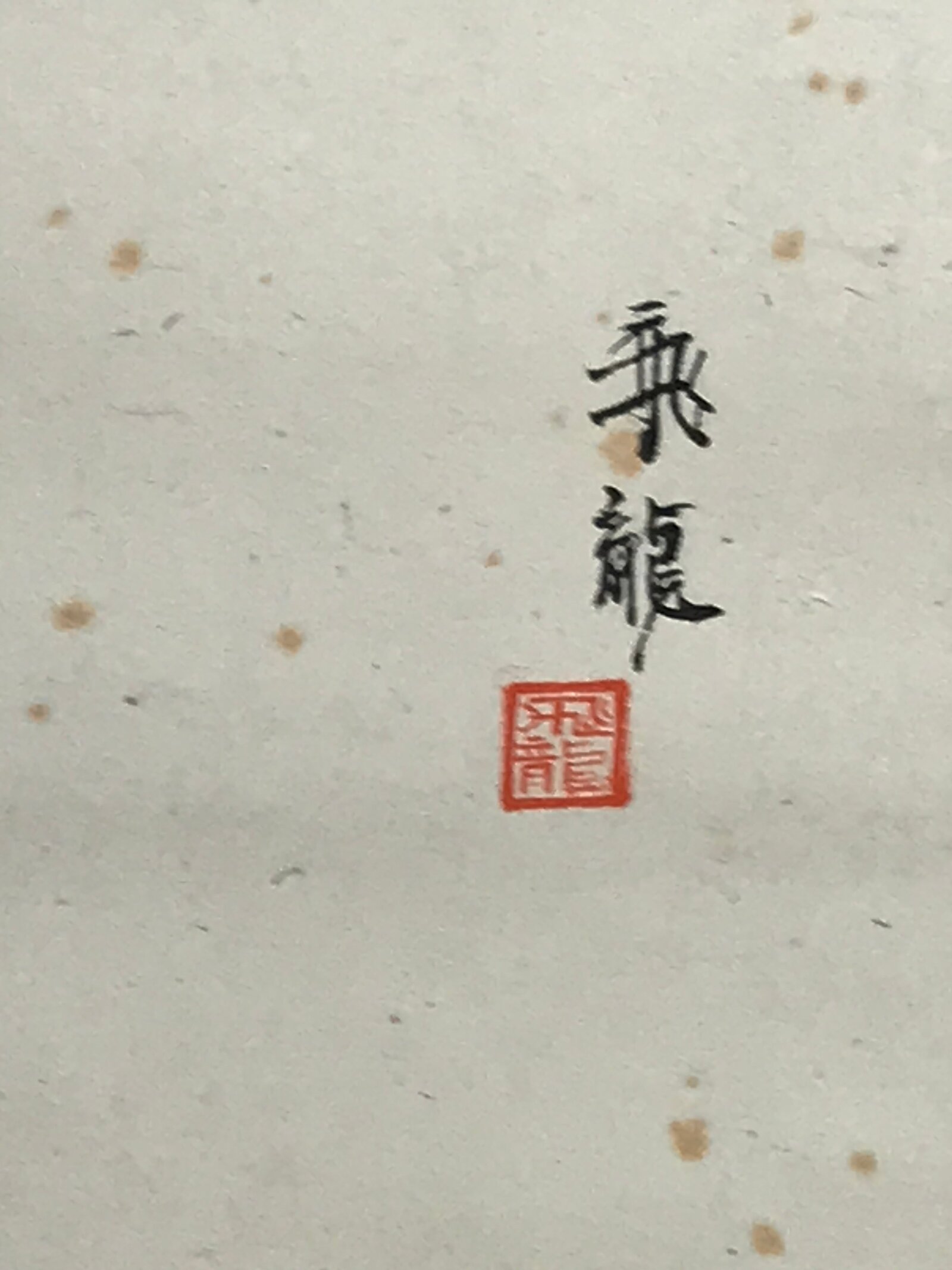 This antique Japanese hanging scroll (kakejiku or makimono) represents a flying bird with a rope, some green leaves from a plant, and a black, red and white flower. This type of kakejiku is called kacho, meaning bird and flower. This piece is signed with a name and a red seal.