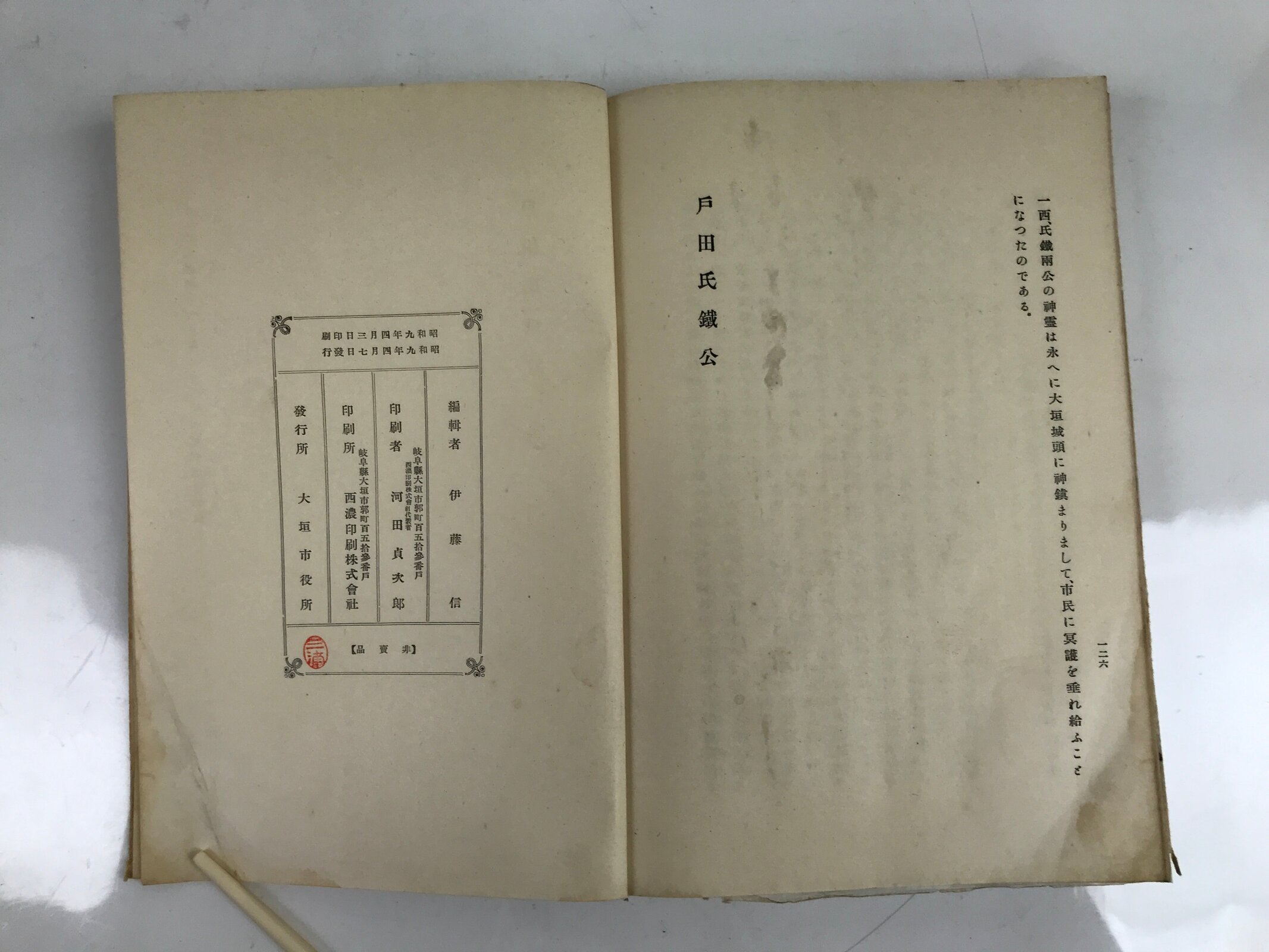 This antique Japanese history book is a biography of Toda Ujikane, a feudal lord of the 17th century. This book includes mostly texts but also some colored maps and a black-and-white picture at the beginning. It was published in 1934 (Showa 9).