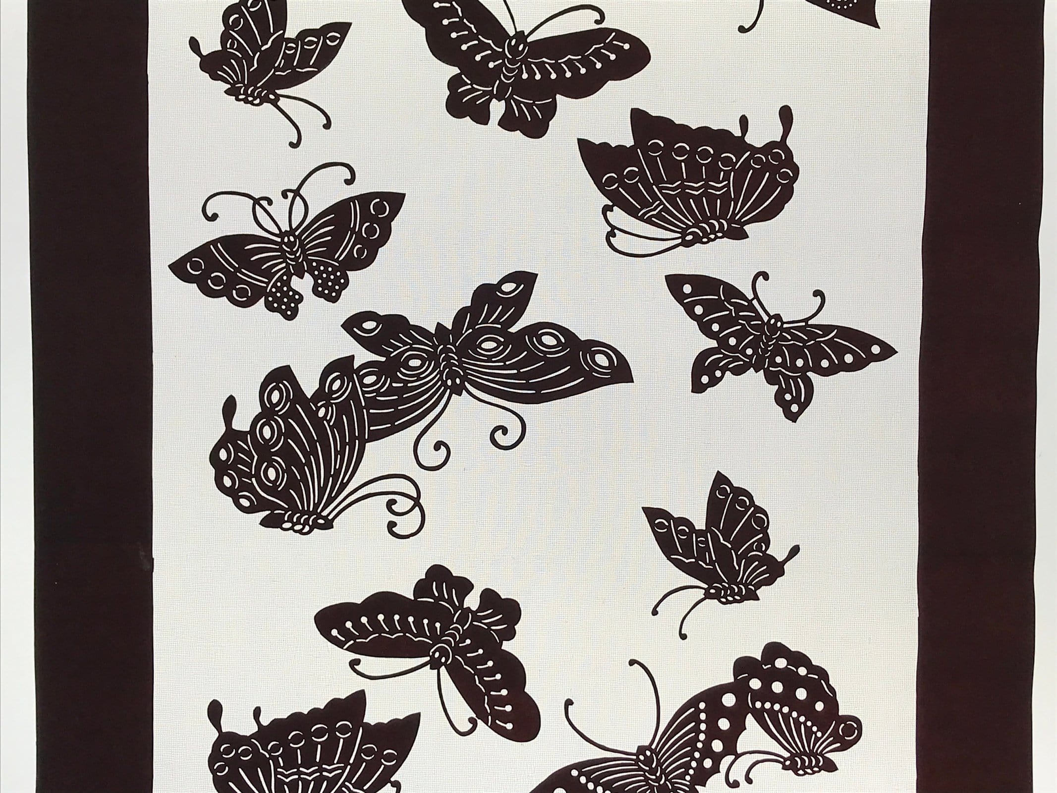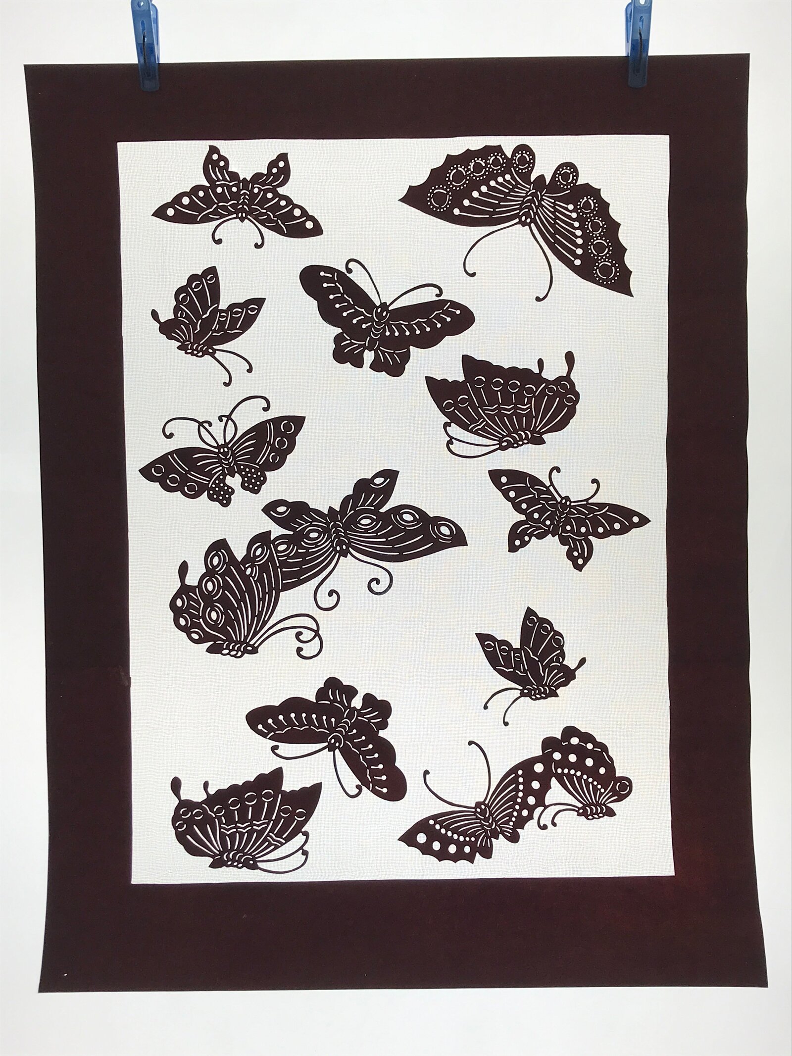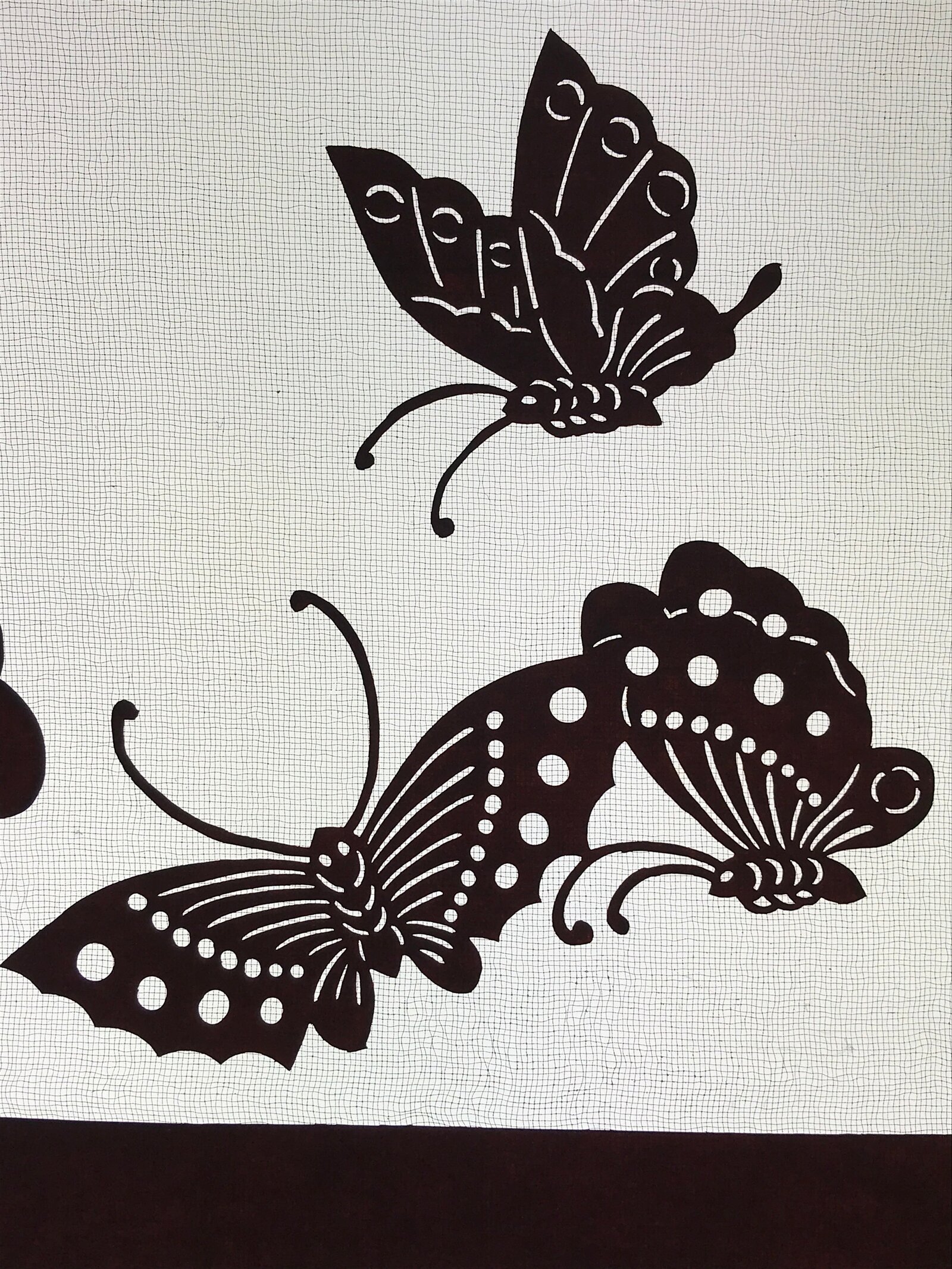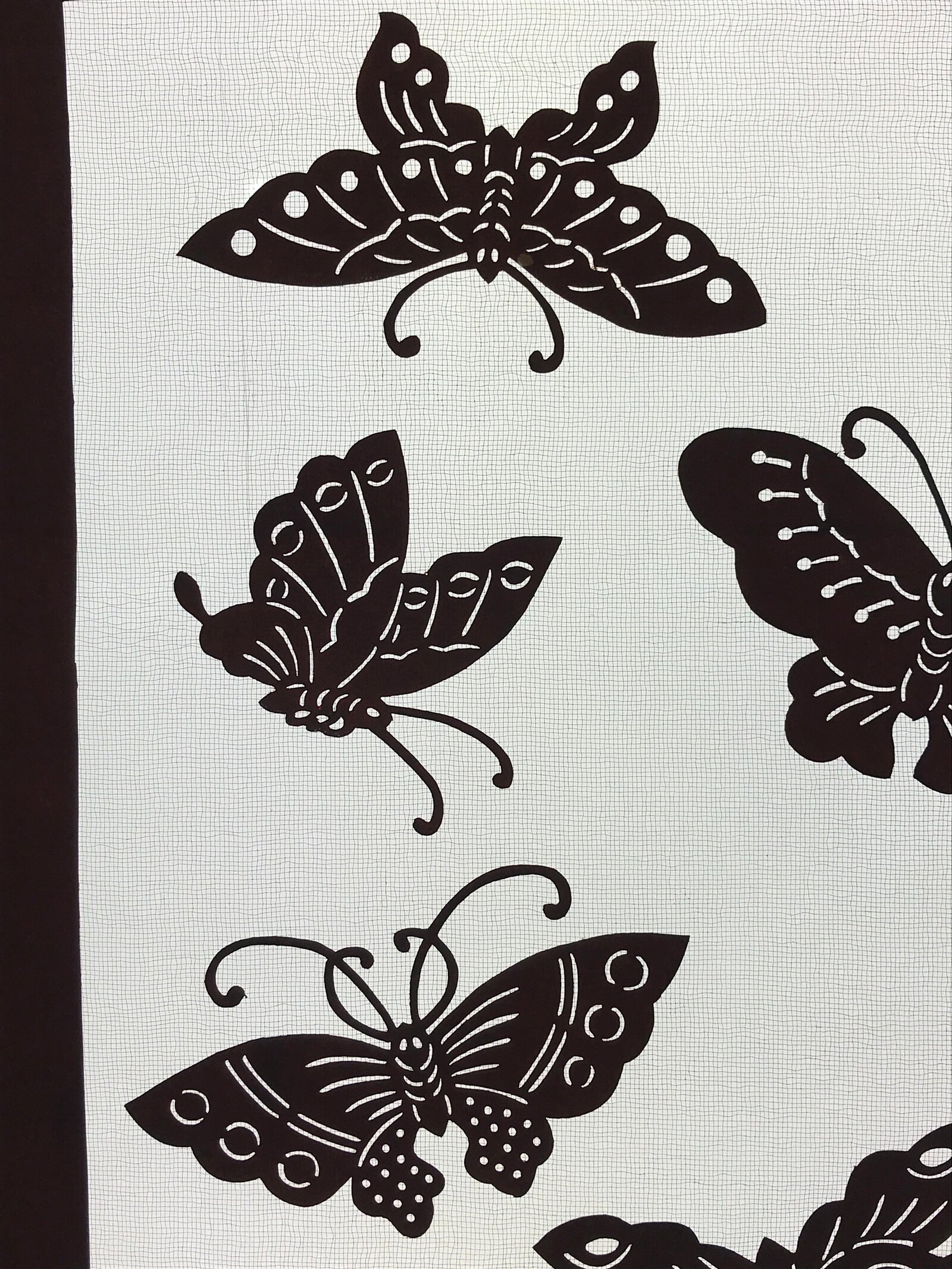 Using traditional mulberry paper, this katagami stencil with silk mesh backing is decorated with a kaleidoscope of fluttering butterflies.